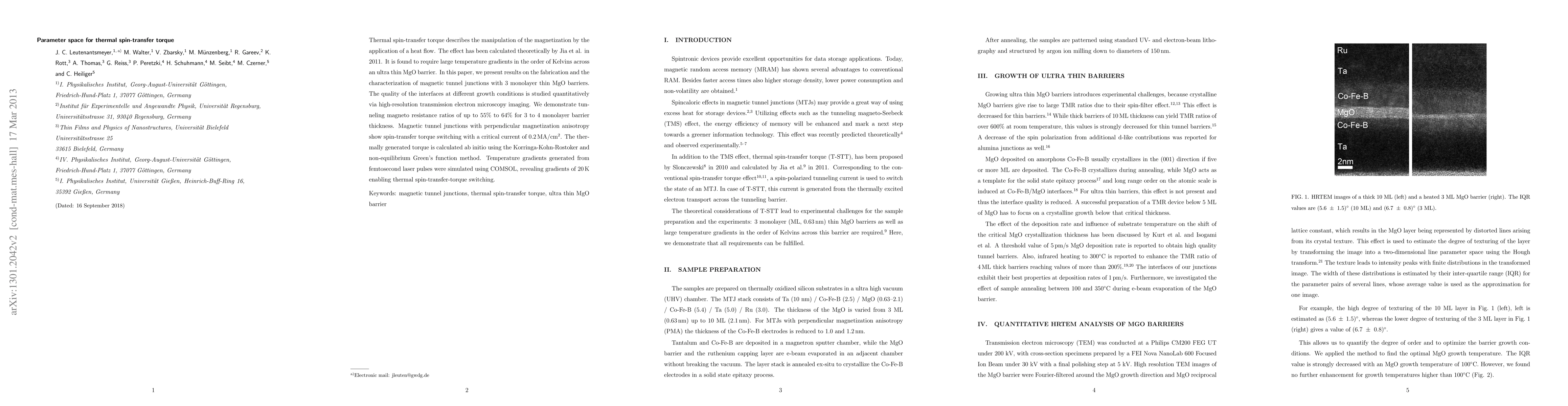 This paper investigates magnetic tunnel junctions with ultra-thin MgO barriers, achieving high tunneling magnetoresistance ratios and demonstrating spin-transfer torque switching via thermal effects. Ab initio calculations and simulations show that femtosecond laser pulses can generate sufficient temperature gradients for thermal spin-transfer torque.