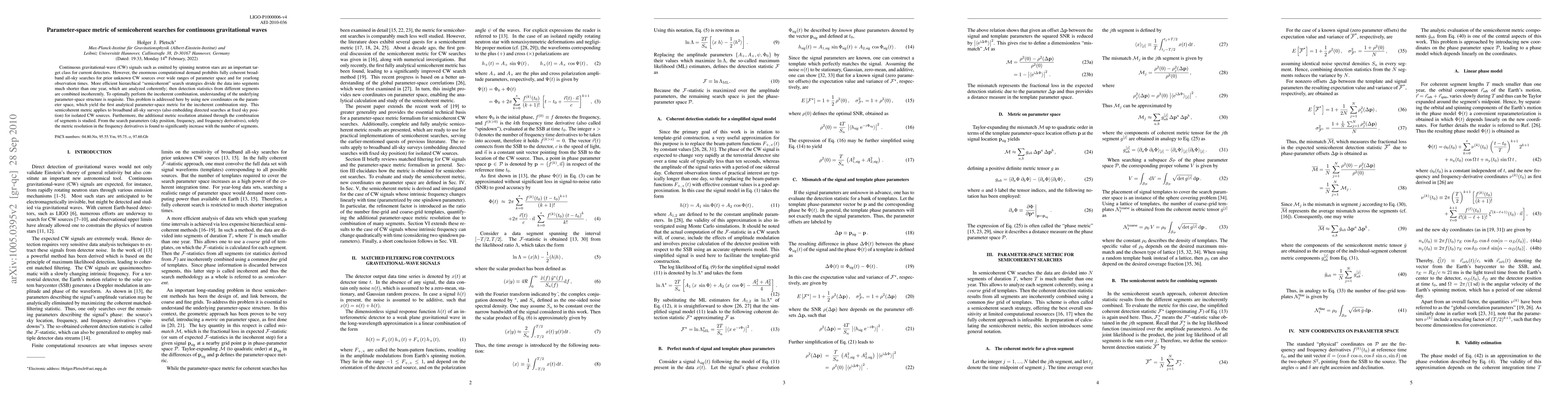 This paper develops an analytical parameter-space metric for semicoherent searches of continuous gravitational waves, enabling efficient incoherent combination of detection statistics from shorter data segments. The study finds that combining more segments significantly enhances frequency derivative resolution, while other parameters remain relatively unchanged.