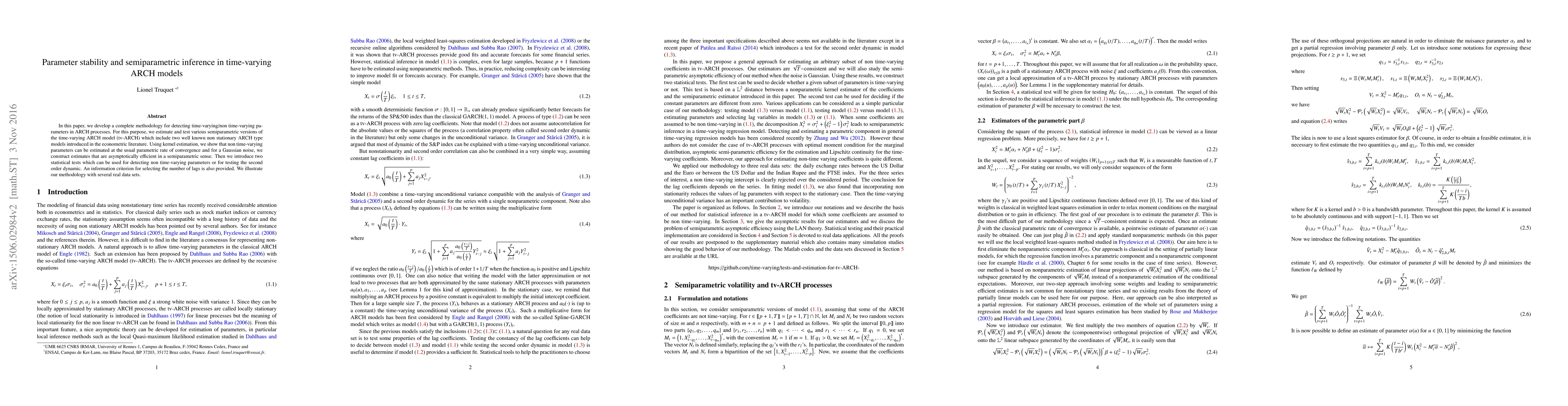 This paper develops a methodology for detecting time-varying parameters in ARCH models using kernel estimation and semiparametric inference, and introduces tests for identifying non time-varying parameters and second-order dynamics, illustrated with real data sets.