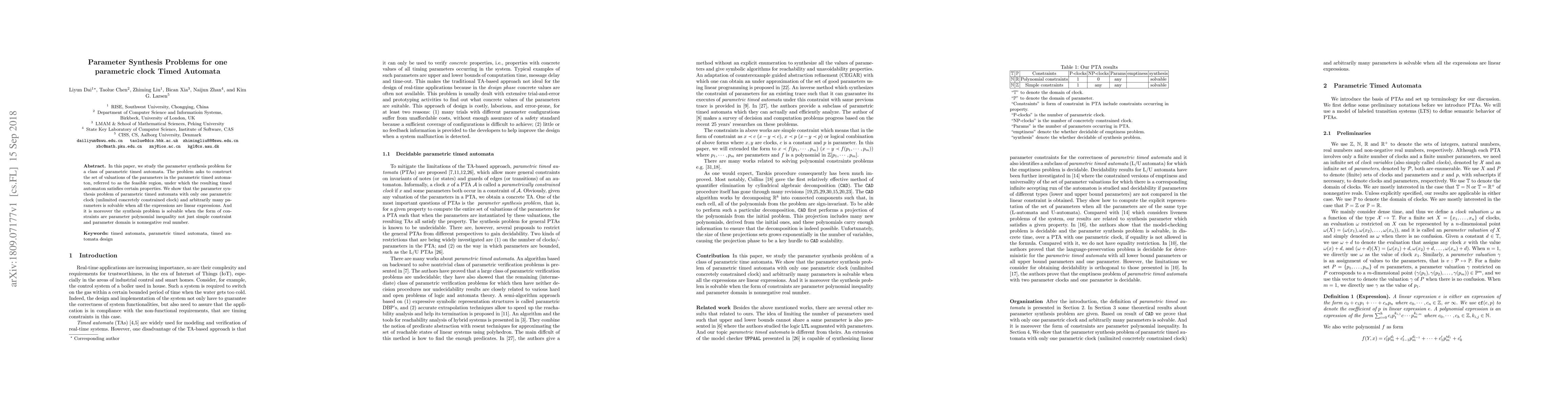 This paper addresses the parameter synthesis problem for parametric timed automata with one parametric clock, demonstrating that the problem is solvable when all expressions are linear and constraints are parameter polynomial inequalities, with parameters constrained to nonnegative real numbers. The solution constructs the feasible region ensuring the automaton satisfies specified properties.
