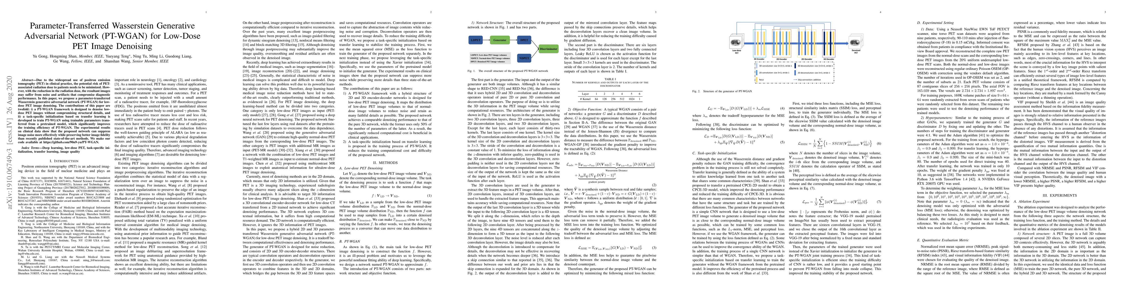 This paper proposes a parameter-transferred Wasserstein generative adversarial network (PT-WGAN) for denoising low-dose PET images, aiming to minimize radiation dose while preserving image quality. The PT-WGAN framework enhances denoising efficiency and preserves structural details, leveraging transfer learning for faster training.