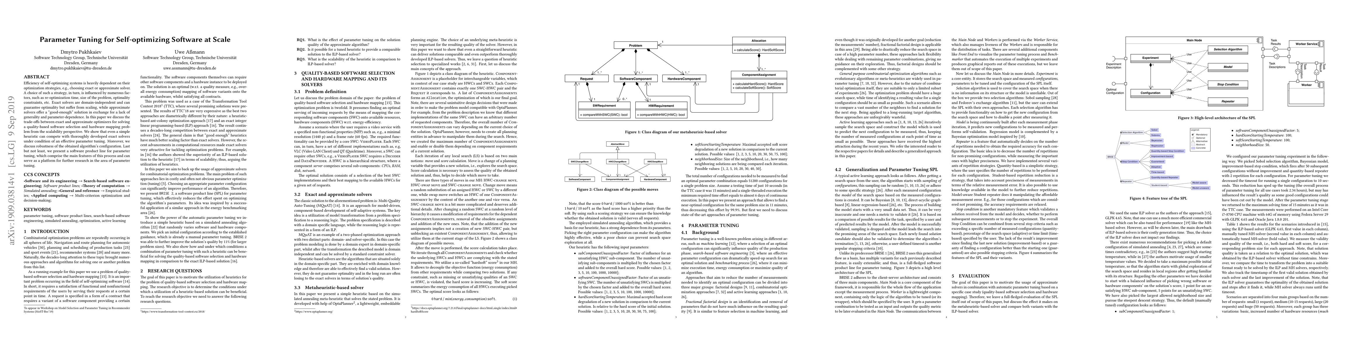 Efficiency of self-optimizing systems is heavily dependent on their optimization strategies, e.g., choosing exact or approximate solver. A choice of such a strategy, in turn, is influenced by numerous factors, such as re-optimization time, size of the problem, optimality constraints, etc. Exact solvers are domain-independent and can guarantee optimality but suffer from scaling, while approximate solvers offer a "good-enough" solution in exchange for a lack of generality and parameter-dependence. In this paper we discuss the trade-offs between exact and approximate optimizers for solving a quality-based software selection and hardware mapping problem from the scalability perspective. We show that even a simple heuristic can compete with thoroughly developed exact solvers under condition of an effective parameter tuning. Moreover, we discuss robustness of the obtained algorithm's configuration. Last but not least, we present a software product line for parameter tuning, which comprise the main features of this process and can serve as a platform for further research in the area of parameter tuning.
