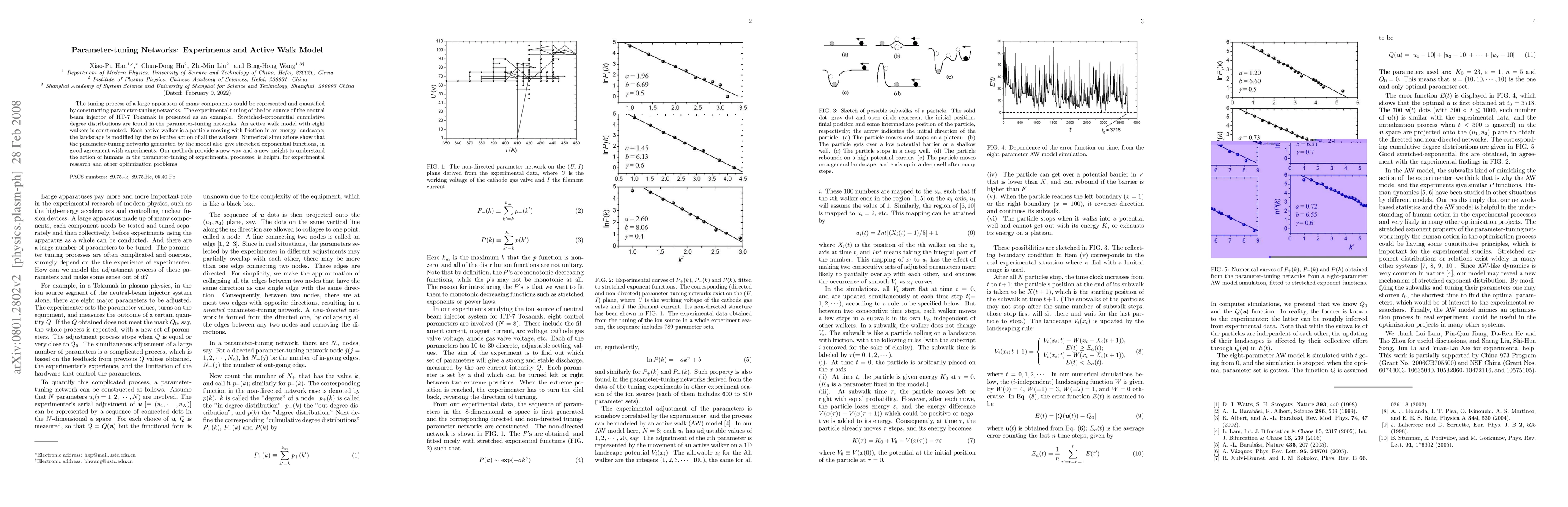 The tuning process of a large apparatus of many components could be represented and quantified by constructing parameter-tuning networks. The experimental tuning of the ion source of the neutral beam injector of HT-7 Tokamak is presented as an example. Stretched-exponential cumulative degree distributions are found in the parameter-tuning networks. An active walk model with eight walkers is constructed. Each active walker is a particle moving with friction in an energy landscape; the landscape is modified by the collective action of all the walkers. Numerical simulations show that the parameter-tuning networks generated by the model also give stretched exponential functions, in good agreement with experiments. Our methods provide a new way and a new insight to understand the action of humans in the parameter-tuning of experimental processes, is helpful for experimental research and other optimization problems.