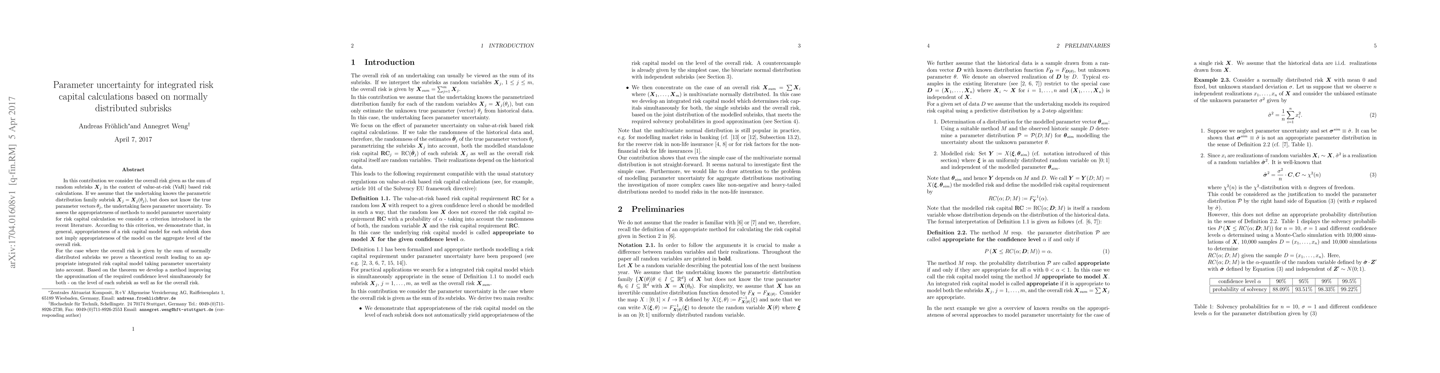 This paper examines parameter uncertainty in integrated risk capital calculations for normally distributed subrisks, demonstrating that the appropriateness of subrisk models does not guarantee appropriateness at the aggregate level. It proposes a theoretical result and a method to improve confidence level approximation for both individual subrisks and the overall risk.