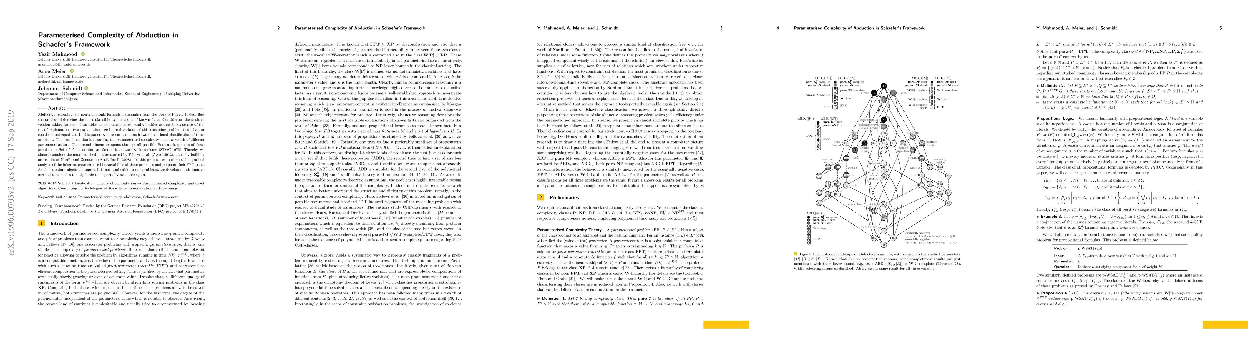 This paper classifies the complexity of abduction problems in Schaefer's framework, identifying their parameterised intractability and pinpointing parts that are solvable in polynomial time.