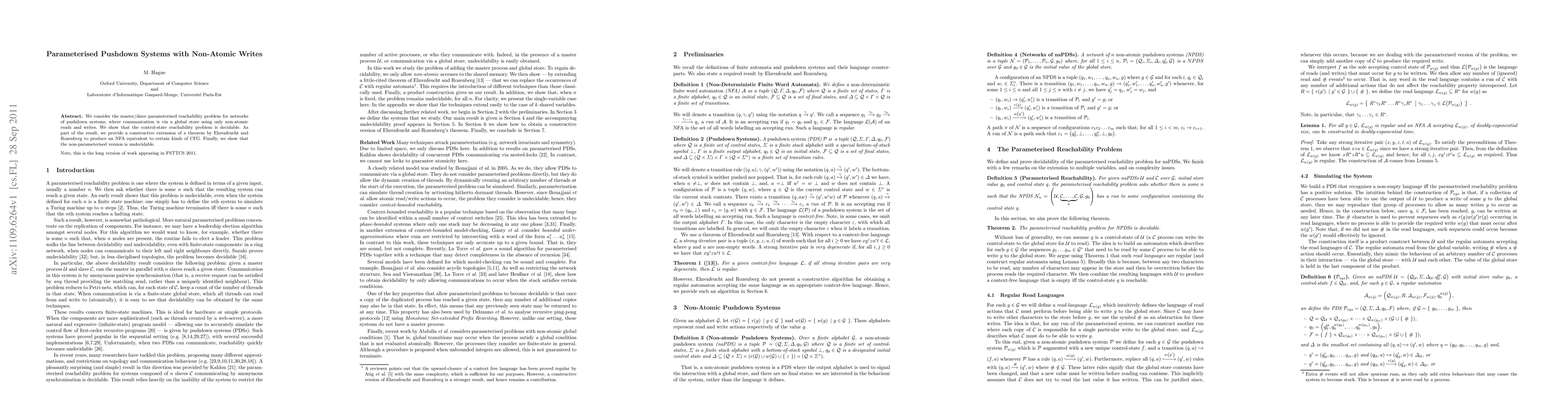 We consider the master/slave parameterised reachability problem for networks of pushdown systems, where communication is via a global store using only non-atomic reads and writes. We show that the control-state reachability problem is decidable. As part of the result, we provide a constructive extension of a theorem by Ehrenfeucht and Rozenberg to produce an NFA equivalent to certain kinds of CFG. Finally, we show that the non-parameterised version is undecidable.