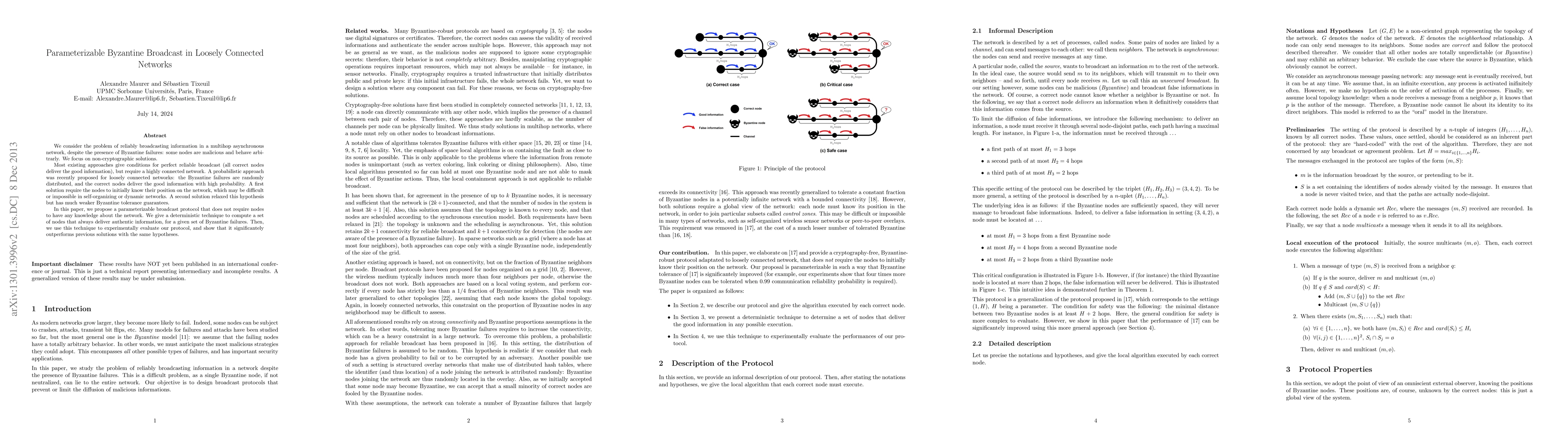 This paper proposes a parameterizable broadcast protocol for reliably disseminating information in asynchronous, multihop networks with Byzantine failures, without requiring nodes to know their position on the network. The protocol significantly outperforms previous solutions, though the results are currently unpublished and presented as incomplete technical report findings.