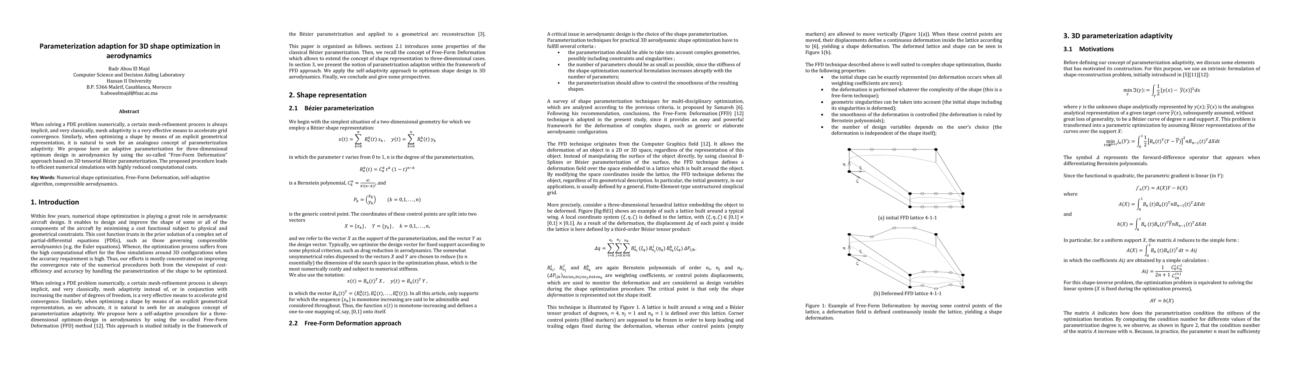 This research introduces an adaptive parameterization method for optimizing 3D shapes in aerodynamics, employing Free-Form Deformation with 3D tensorial Bézier parameterization. The approach significantly reduces computational costs and accelerates grid convergence in numerical simulations.