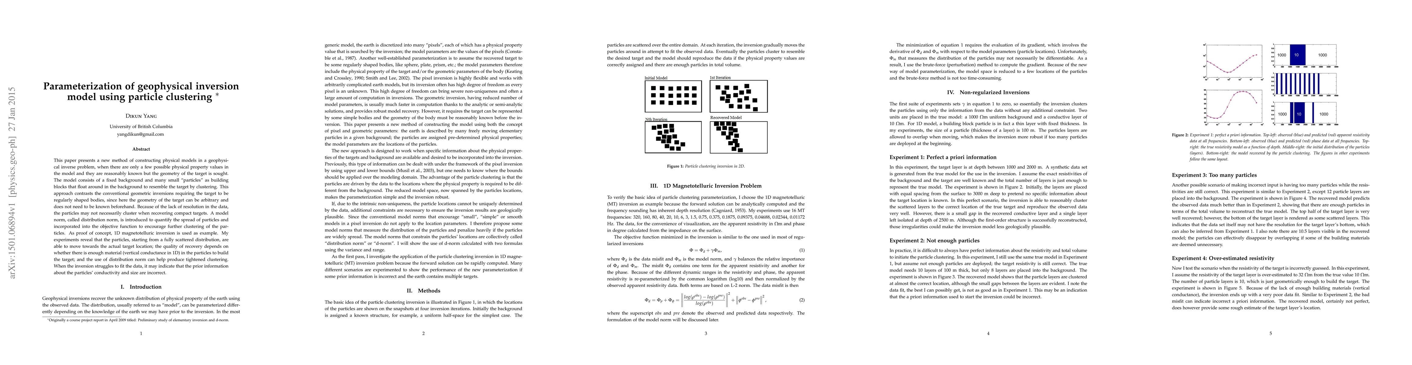This paper presents a new method of constructing physical models in a geophysical inverse problem, when there are only a few possible physical property values in the model and they are reasonably known but the geometry of the target is sought. The model consists of a fixed background and many small "particles" as building blocks that float around in the background to resemble the target by clustering. This approach contrasts the conventional geometric inversions requiring the target to be regularly shaped bodies, since here the geometry of the target can be arbitrary and does not need to be known beforehand. Because of the lack of resolution in the data, the particles may not necessarily cluster when recovering compact targets. A model norm, called distribution norm, is introduced to quantify the spread of particles and incorporated into the objective function to encourage further clustering of the particles. As proof of concept, 1D magnetotelluric inversion is used as example. My experiments reveal that the particles, starting from a fully scattered distribution, are able to move towards the actual target location; the quality of recovery depends on whether there is enough material (vertical conductance in 1D) in the particles to build the target; and the use of distribution norm can help produce tightened clustering. When the inversion struggles to fit the data, it may indicate that the prior information about the particles' conductivity and size are incorrect.