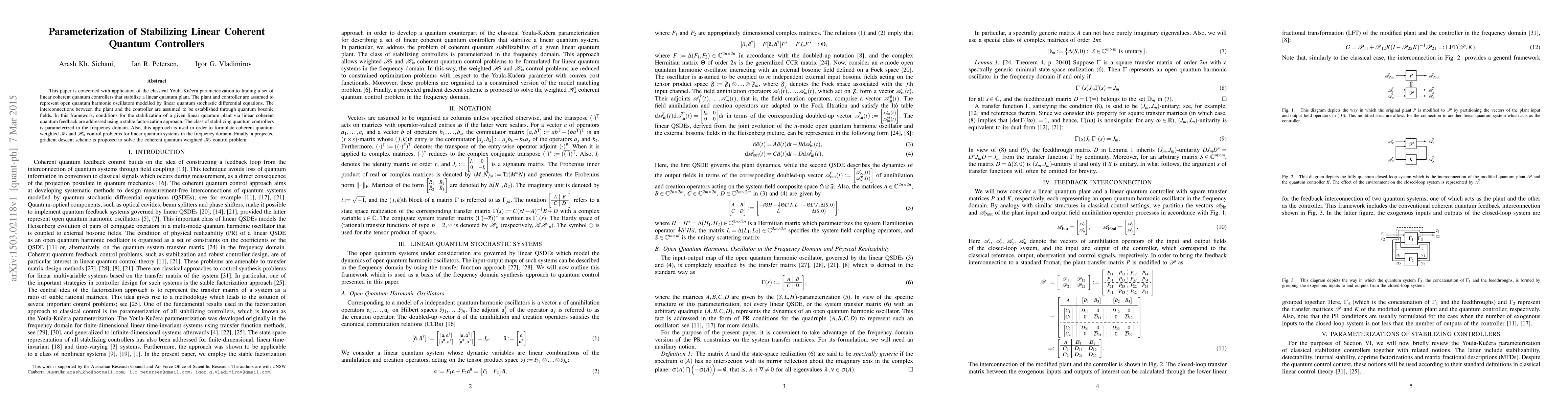 This paper explores the classical Youla-Kučera parameterization to identify linear coherent quantum controllers that stabilize linear quantum plants modeled as open quantum harmonic oscillators. It formulates coherent quantum weighted $H_2$ and $H_\infty$ control problems and proposes a projected gradient descent scheme to solve the $H_2$ control problem.