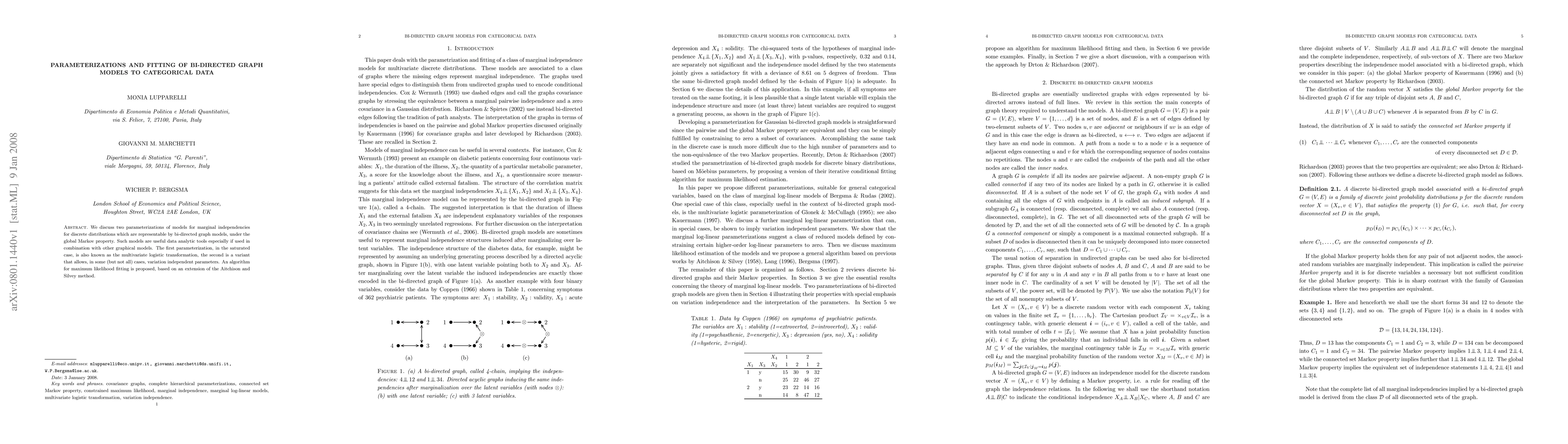 We discuss two parameterizations of models for marginal independencies for discrete distributions which are representable by bi-directed graph models, under the global Markov property. Such models are useful data analytic tools especially if used in combination with other graphical models. The first parameterization, in the saturated case, is also known as the multivariate logistic transformation, the second is a variant that allows, in some (but not all) cases, variation independent parameters. An algorithm for maximum likelihood fitting is proposed, based on an extension of the Aitchison and Silvey method.