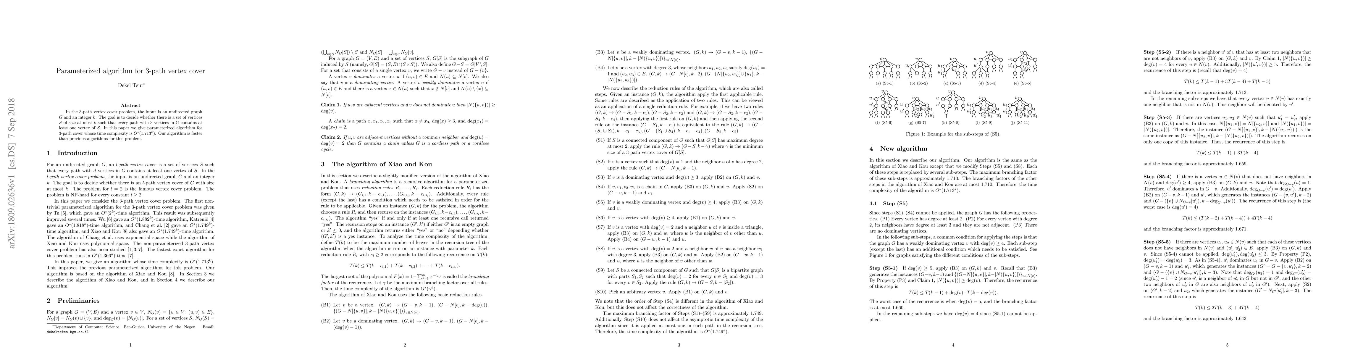 The research presents a parameterized algorithm for the 3-path vertex cover problem, modifying steps (S5) and (S8) of an existing algorithm by Xiao and Kou.