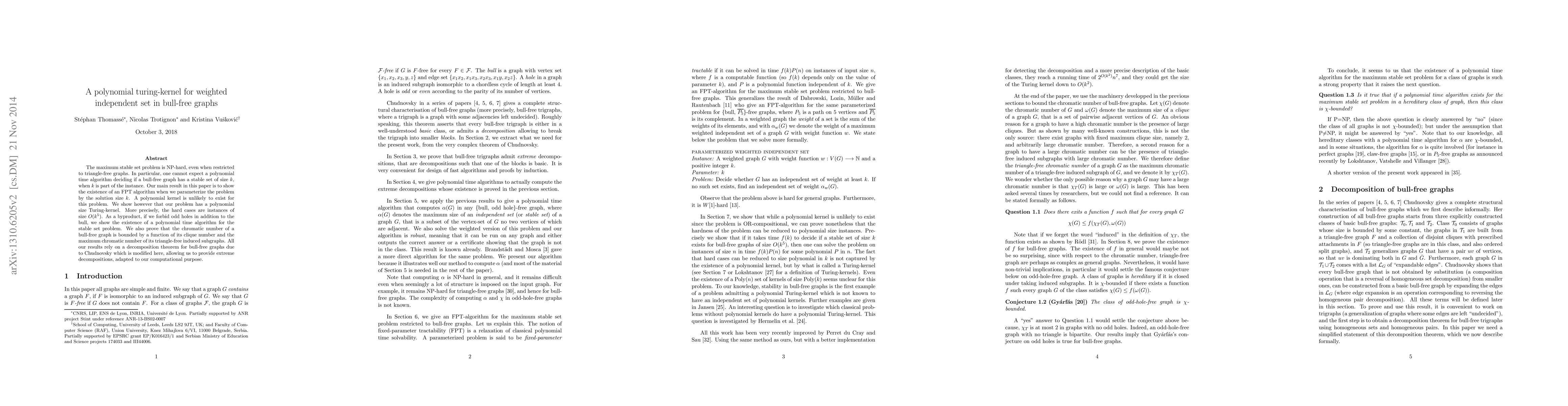 This paper presents an FPT algorithm for the weighted independent set problem in bull-free graphs, parameterized by the solution size $k$. The study also shows a polynomial size Turing-kernel for the problem, with hard cases of size $O(k^5)$, and a polynomial time algorithm for the stable set problem when odd holes are additionally forbidden.