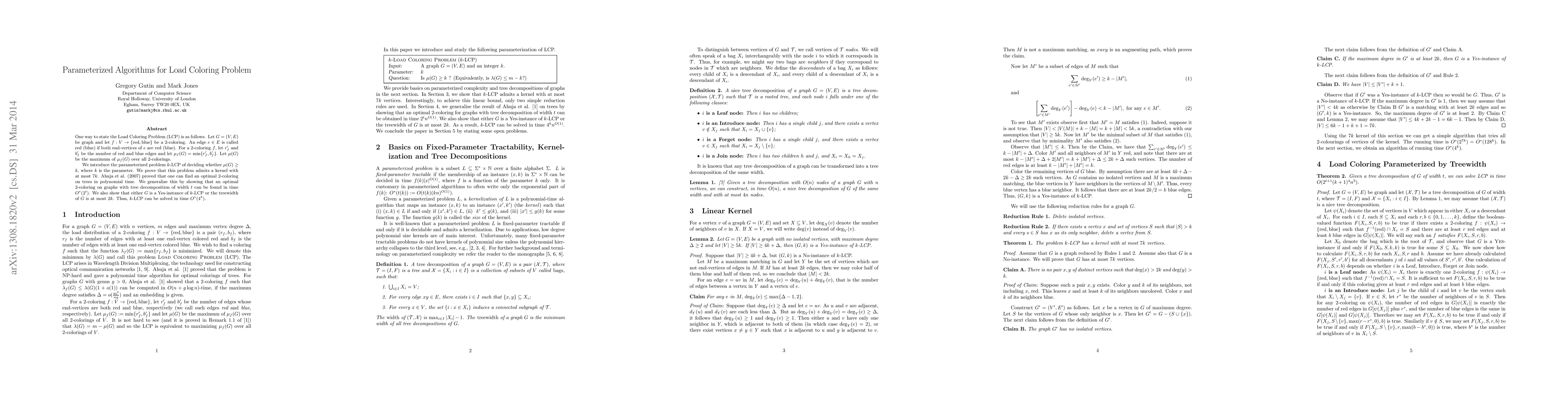 One way to state the Load Coloring Problem (LCP) is as follows. Let $G=(V,E)$ be graph and let $f:V\rightarrow \{{\rm red}, {\rm blue}\}$ be a 2-coloring. An edge $e\in E$ is called red (blue) if both end-vertices of $e$ are red (blue). For a 2-coloring $f$, let $r'_f$ and $b'_f$ be the number of red and blue edges and let $\mu_f(G)=\min\{r'_f,b'_f\}$. Let $\mu(G)$ be the maximum of $\mu_f(G)$ over all 2-colorings. We introduce the parameterized problem $k$-LCP of deciding whether $\mu(G)\ge k$, where $k$ is the parameter. We prove that this problem admits a kernel with at most $7k$. Ahuja et al. (2007) proved that one can find an optimal 2-coloring on trees in polynomial time. We generalize this by showing that an optimal 2-coloring on graphs with tree decomposition of width $t$ can be found in time $O^*(2^t)$. We also show that either $G$ is a Yes-instance of $k$-LCP or the treewidth of $G$ is at most $2k$. Thus, $k$-LCP can be solved in time $O^*(4^k).$