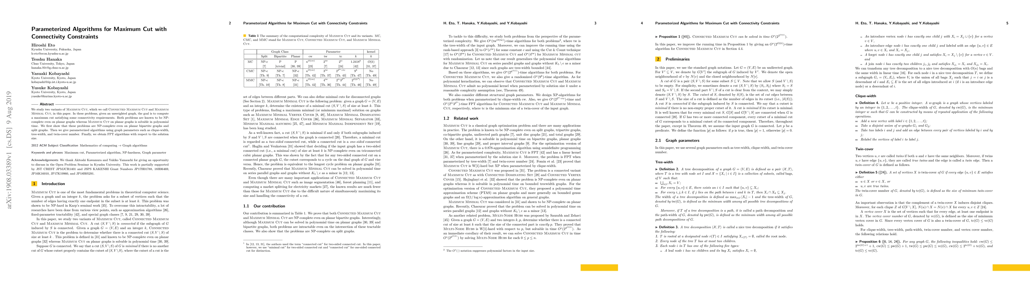 This paper investigates two NP-complete variants of the Maximum Cut problem with connectivity constraints, showing they remain hard even on planar bipartite and split graphs. It introduces parameterized algorithms using clique-width, tree-width, and twin-cover number, and presents FPT algorithms based on the solution size.