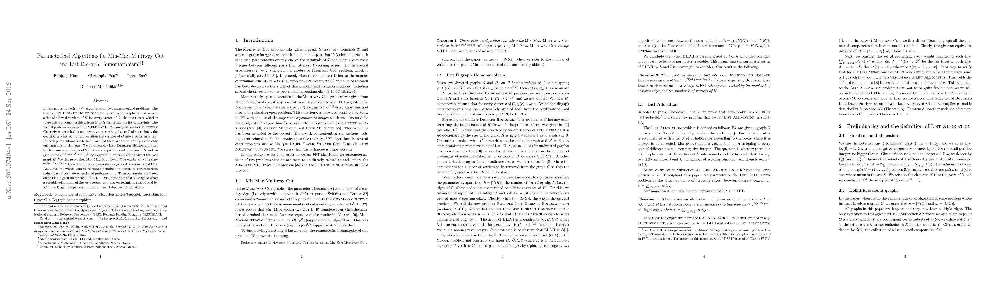 In this paper we design {\sf FPT}-algorithms for two parameterized problems. The first is \textsc{List Digraph Homomorphism}: given two digraphs $G$ and $H$ and a list of allowed vertices of $H$ for every vertex of $G$, the question is whether there exists a homomorphism from $G$ to $H$ respecting the list constraints. The second problem is a variant of \textsc{Multiway Cut}, namely \textsc{Min-Max Multiway Cut}: given a graph $G$, a non-negative integer $\ell$, and a set $T$ of $r$ terminals, the question is whether we can partition the vertices of $G$ into $r$ parts such that (a) each part contains one terminal and (b) there are at most $\ell$ edges with only one endpoint in this part. We parameterize \textsc{List Digraph Homomorphism} by the number $w$ of edges of $G$ that are mapped to non-loop edges of $H$ and we give a time $2^{O(\ell\cdot\log h+\ell^2\cdot \log \ell)}\cdot n^{4}\cdot \log n$ algorithm, where $h$ is the order of the host graph $H$. We also prove that \textsc{Min-Max Multiway Cut} can be solved in time $2^{O((\ell r)^2\log \ell r)}\cdot n^{4}\cdot \log n$. Our approach introduces a general problem, called {\sc List Allocation}, whose expressive power permits the design of parameterized reductions of both aforementioned problems to it. Then our results are based on an {\sf FPT}-algorithm for the {\sc List Allocation} problem that is designed using a suitable adaptation of the {\em randomized contractions} technique (introduced by [Chitnis, Cygan, Hajiaghayi, Pilipczuk, and Pilipczuk, FOCS 2012]).
