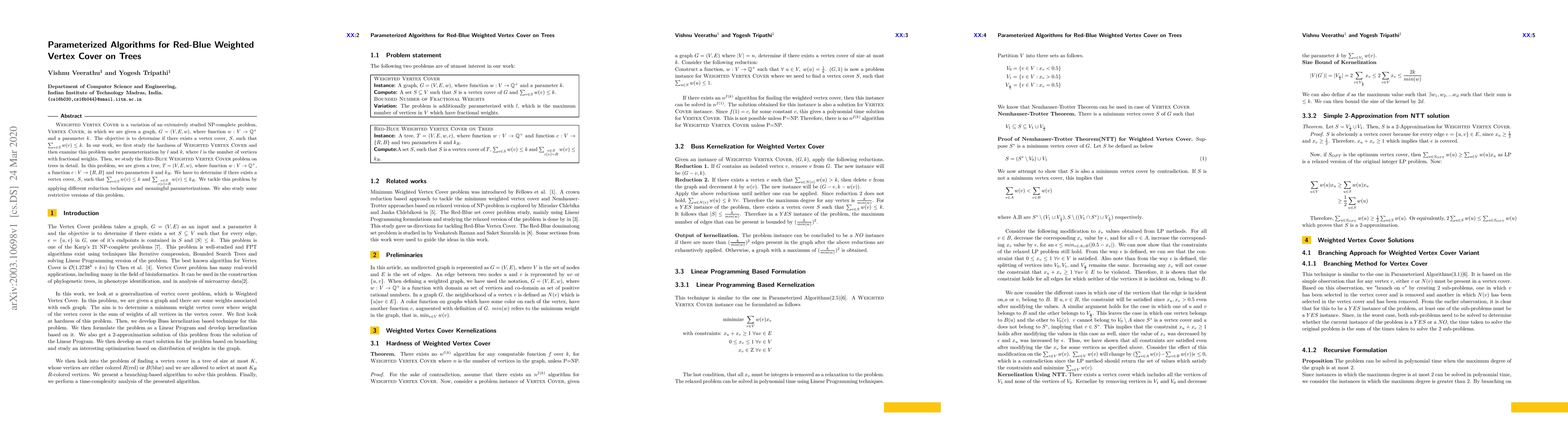This paper investigates the complexity and parameterized algorithms for the \textproc{Red-Blue Weighted Vertex Cover} problem on trees, focusing on the challenge of finding a vertex cover that respects both total and red-specific weight constraints. The authors explore the problem's hardness and develop effective parameterized solutions using reduction techniques.