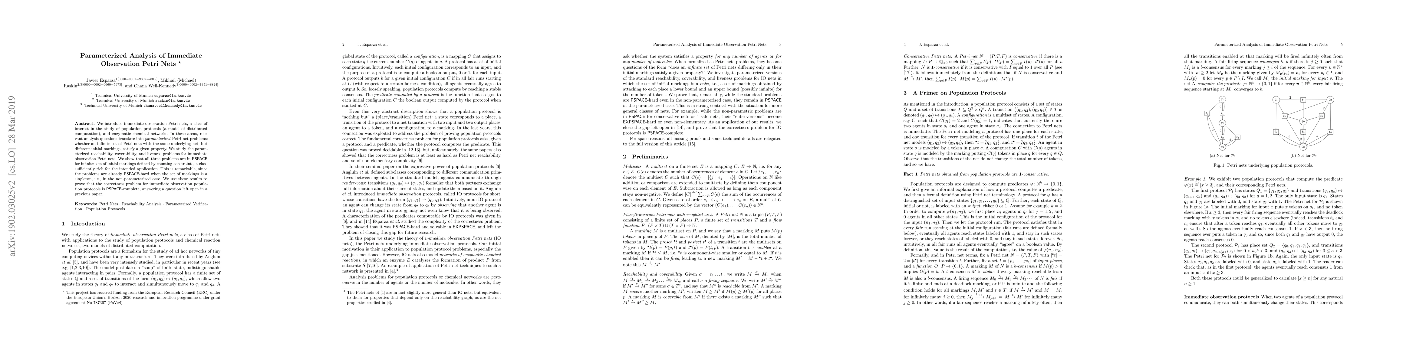 This paper studies immediate observation Petri nets within the context of population protocols and enzymatic networks, focusing on parameterized reachability, coverability, and liveness problems. It demonstrates that these problems are in PSPACE for infinite sets of initial markings defined by counting constraints, providing a significant advancement over the PSPACE-hardness for singleton initial markings.
