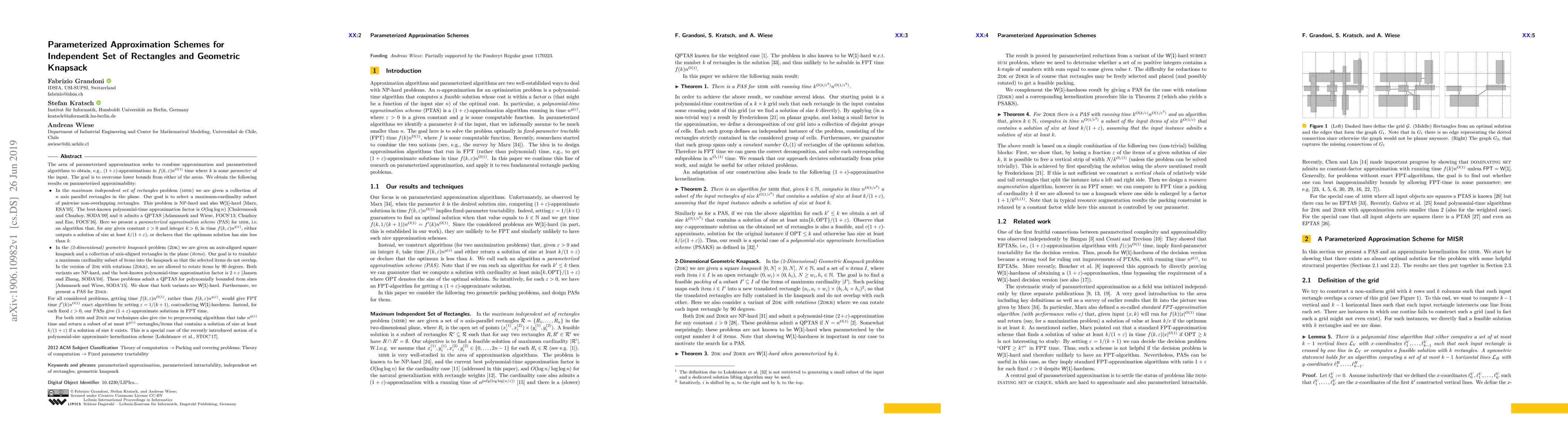 This paper presents parameterized approximation schemes (PAS) for the maximum independent set of rectangles (MISR) and the geometric knapsack problem (TDKR). For MISR, it provides a PAS that guarantees a solution of size at least k/(1+eps) in f(k,eps)n^{g(eps)} time. For TDKR, it also offers a PAS achieving similar performance, while confirming both problems' W[1]-hardness.
