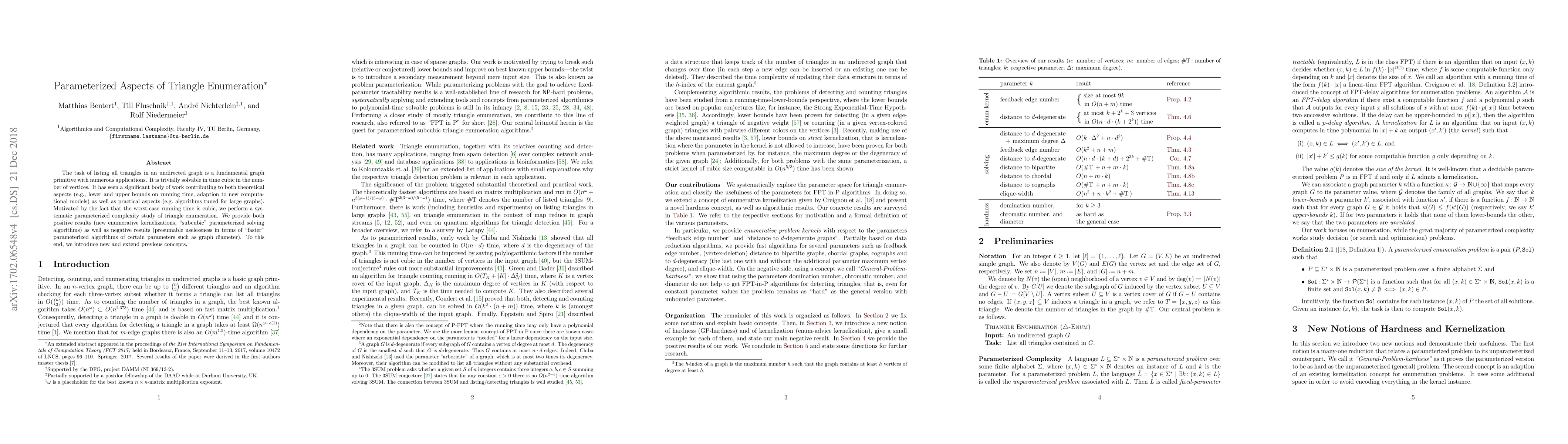 This paper investigates the parameterized complexity of enumerating triangles in undirected graphs, presenting both new efficient algorithms and proving the inefficacy of certain parameters for faster solutions. It introduces novel concepts and extends previous work to address the cubic worst-case running time.