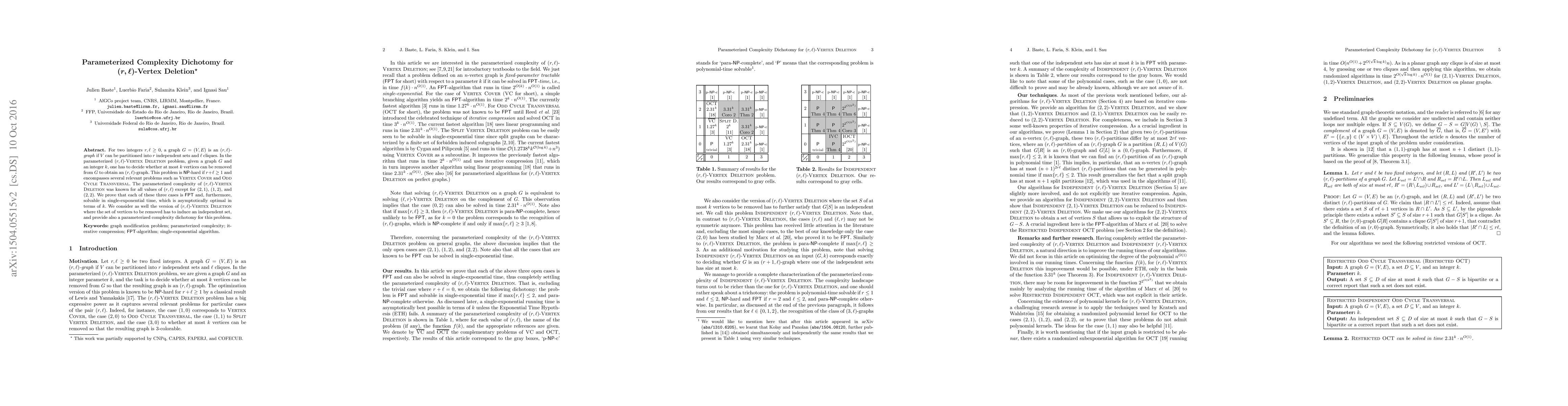 This paper proves that the parameterized complexity of the $(r,\ell)$-Vertex Deletion problem is fixed-parameter tractable (FPT) and solvable in single-exponential time for the cases $(r,\ell) = (2,1)$, $(1,2)$, and $(2,2)$. It also addresses the variant where removed vertices must induce an independent set, providing a parameterized complexity dichotomy.