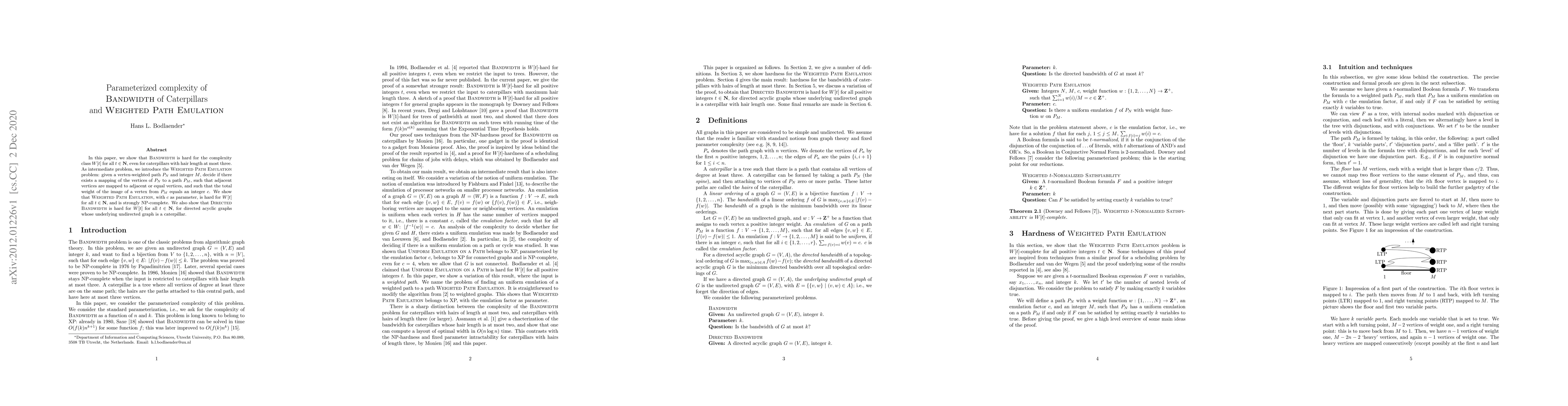 In this paper, we show that Bandwidth is hard for the complexity class $W[t]$ for all $t\in {\bf N}$, even for caterpillars with hair length at most three. As intermediate problem, we introduce the Weighted Path Emulation problem: given a vertex-weighted path $P_N$ and integer $M$, decide if there exists a mapping of the vertices of $P_N$ to a path $P_M$, such that adjacent vertices are mapped to adjacent or equal vertices, and such that the total weight of the image of a vertex from $P_M$ equals an integer $c$. We show that {\sc Weighted Path Emulation}, with $c$ as parameter, is hard for $W[t]$ for all $t\in {\bf N}$, and is strongly NP-complete. We also show that Directed Bandwidth is hard for $W[t]$ for all $t\in {\bf N}$, for directed acyclic graphs whose underlying undirected graph is a caterpillar.