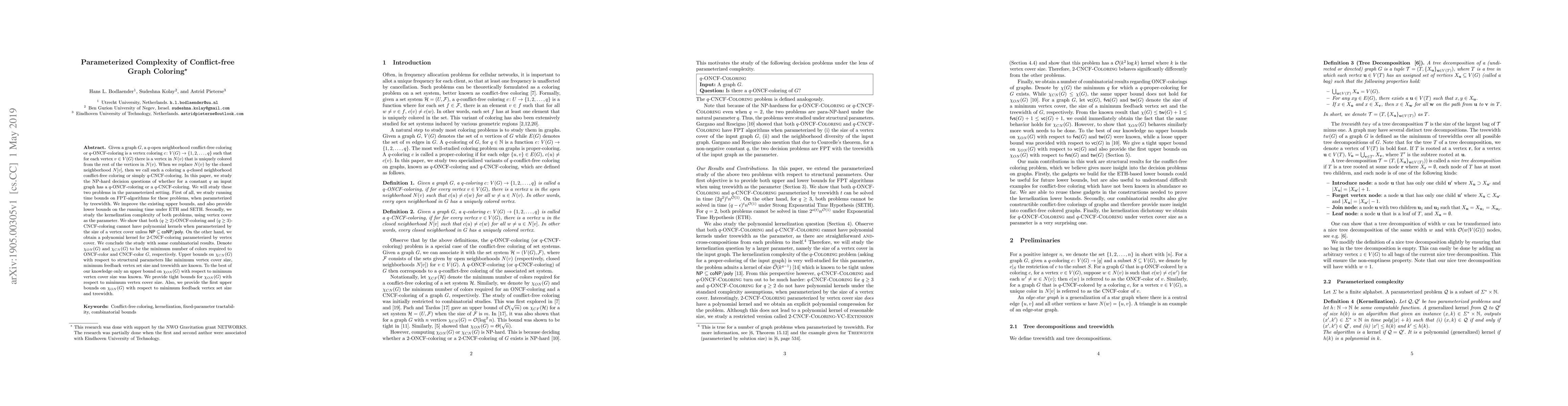 Given a graph G, a q-open neighborhood conflict-free coloring or q-ONCF-coloring is a vertex coloring $c:V(G) \rightarrow \{1,2,\ldots,q\}$ such that for each vertex $v \in V(G)$ there is a vertex in $N(v)$ that is uniquely colored from the rest of the vertices in $N(v)$. When we replace $N(v)$ by the closed neighborhood $N[v]$, then we call such a coloring a q-closed neighborhood conflict-free coloring or simply q-CNCF-coloring. In this paper, we study the NP-hard decision questions of whether for a constant q an input graph has a q-ONCF-coloring or a q-CNCF-coloring. We will study these two problems in the parameterized setting. First of all, we study running time bounds on FPT-algorithms for these problems, when parameterized by treewidth. We improve the existing upper bounds, and also provide lower bounds on the running time under ETH and SETH. Secondly, we study the kernelization complexity of both problems, using vertex cover as the parameter. We show that both $(q \geq 2)$-ONCF-coloring and $(q \geq 3)$-CNCF-coloring cannot have polynomial kernels when parameterized by the size of a vertex cover unless $NP \in coNP/poly$. However, we obtain a polynomial kernel for 2-CNCF-coloring parameterized by vertex cover. We conclude with some combinatorial results. Denote $\chi_{ON}(G)$ and $\chi_{CN}(G)$ to be the minimum number of colors required to ONCF-color and CNCF-color G, respectively. Upper bounds on $\chi_{CN}(G)$ with respect to structural parameters like minimum vertex cover size, minimum feedback vertex set size and treewidth are known. To the best of our knowledge only an upper bound on $\chi_{ON}(G)$ with respect to minimum vertex cover size was known. We provide tight bounds for $\chi_{ON}(G)$ with respect to minimum vertex cover size. Also, we provide the first upper bounds on $\chi_{ON}(G)$ with respect to minimum feedback vertex set size and treewidth.