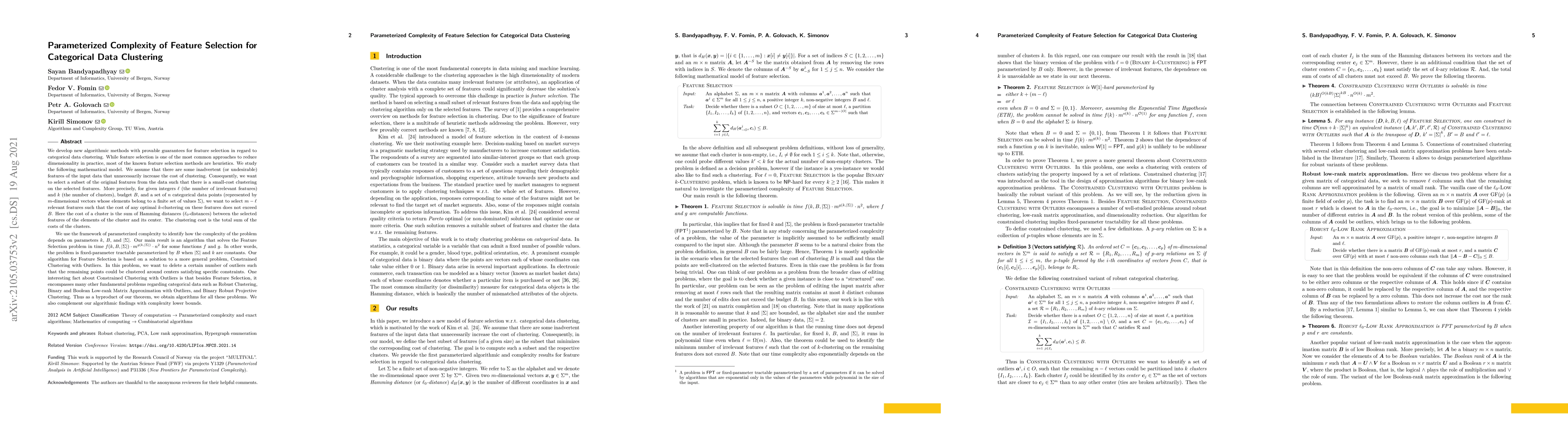 This paper introduces new algorithmic methods with theoretical guarantees for selecting relevant features in categorical data clustering. It develops a fixed-parameter tractable algorithm for the Feature Selection problem, demonstrating how complexity depends on parameters like cluster number, budget, and categorical value set size. The algorithm achieves optimal clustering cost within a specified budget, addressing the challenge of reducing dimensionality through feature selection.
