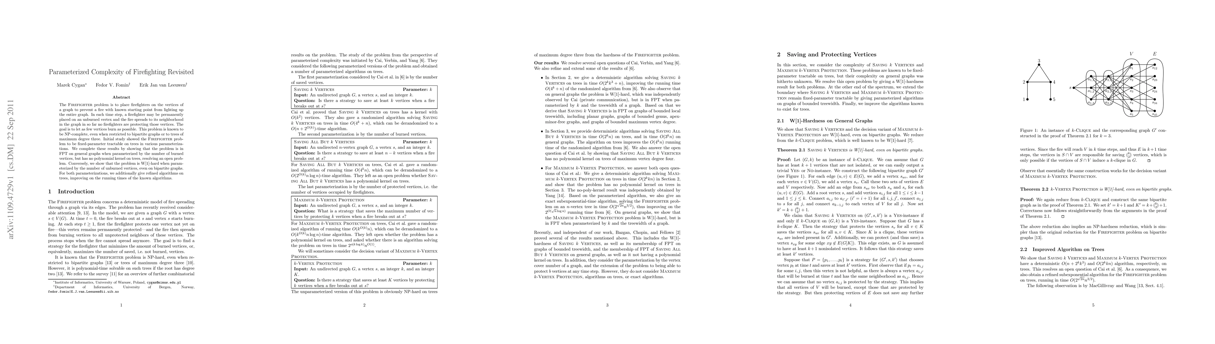 This paper revisits the Firefighter problem, demonstrating its fixed-parameter tractability when parameterized by the number of burned vertices but showing it has no polynomial kernel on trees. It also proves W[1]-hardness when parameterized by unburned vertices, even on bipartite graphs.