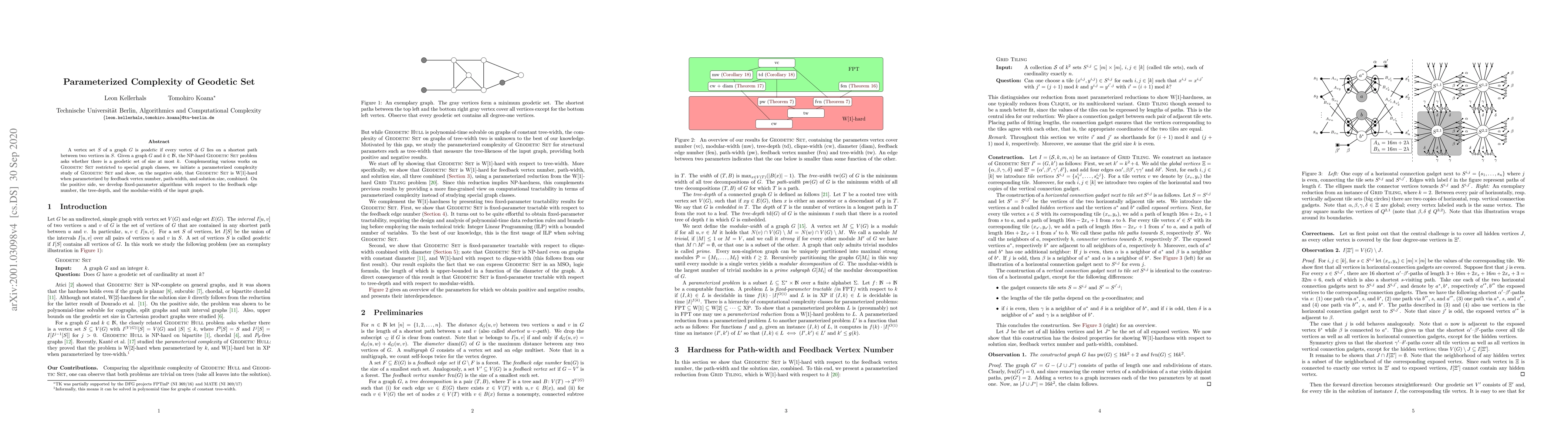 This paper explores the parameterized complexity of the Geodetic Set problem, demonstrating its W[1]-hardness when parameterized by feedback vertex number, path-width, and solution size combined. It also presents fixed-parameter tractable algorithms for parameters such as feedback edge number, tree-depth, and modular-width.