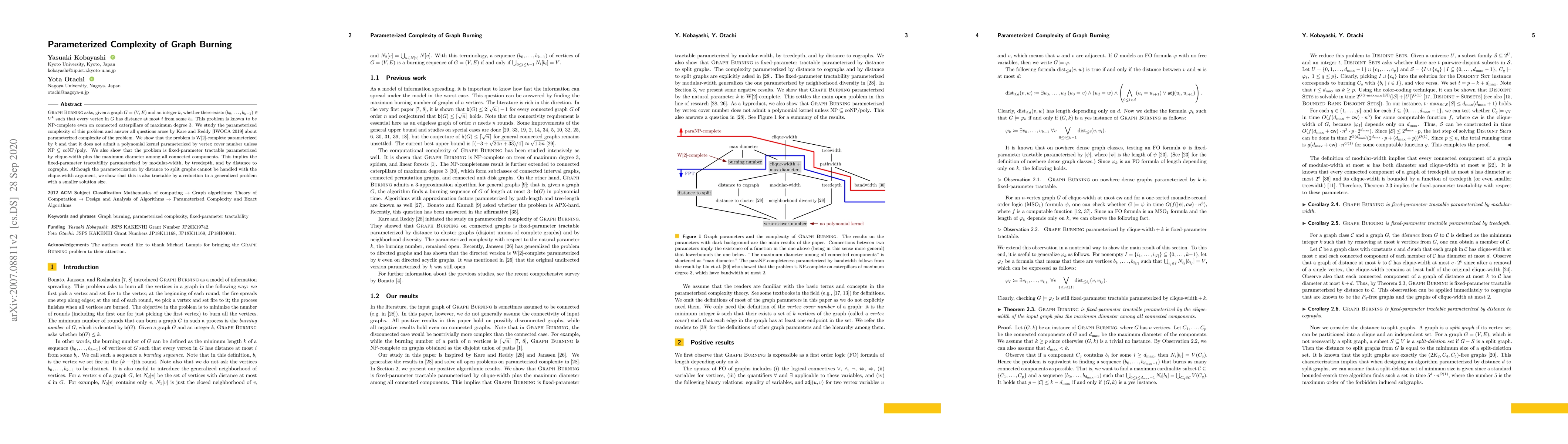 This research contributes to the understanding of the computational complexity of the Graph Burning problem, which has applications in modeling social contagion and other network phenomena. By identifying the parameterized complexity classes, it provides insights into efficient algorithms and intractability results for various graph classes.