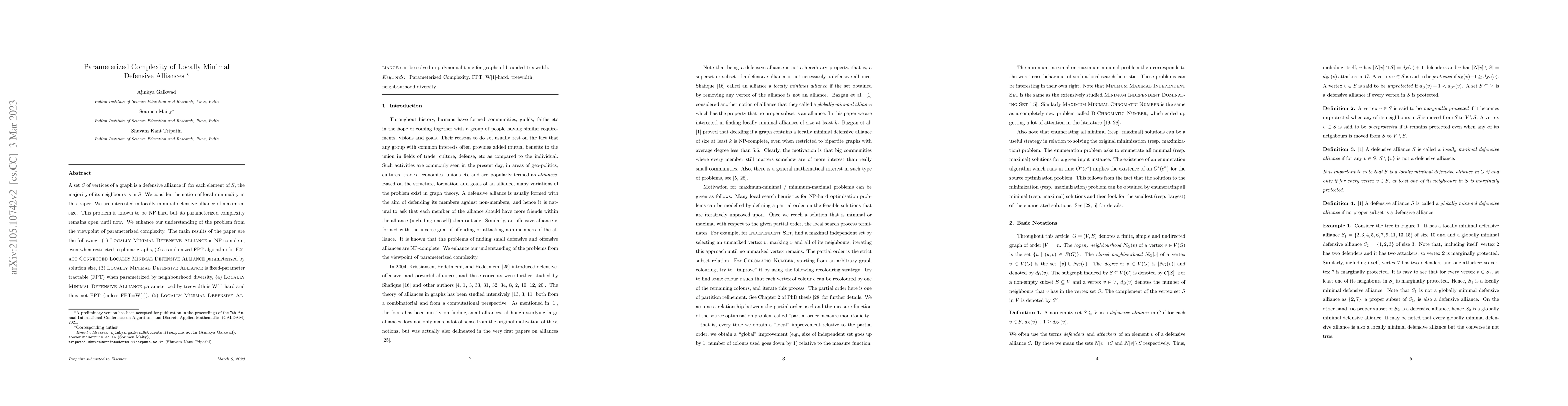 A set $S$ of vertices of a graph is a defensive alliance if, for each element of $S$, the majority of its neighbours is in $S$. We consider the notion of local minimality in this paper. We are interested in locally minimal defensive alliance of maximum size. We also look at connected version of defensive alliance. This problem is known to be NP-hard but its parameterized complexity remains open until now. We enhance our understanding of the problem from the viewpoint of parameterized complexity. The main results of the paper are the following: (1) Locally Minimal Defensive Alliance is NP-complete, even when restricted to planar graphs, (2) a randomized FPT algorithm for Exact Connected Locally Minimal Defensive Alliance parameterized by solution size, (3) Locally Minimal Defensive Alliance is fixed-parameter tractable (FPT) when parametrized by neighbourhood diversity, (4) Locally Minimal Defensive Alliance parameterized by treewidth is W[1]-hard and thus not FPT (unless FPT=W[1]), (5) Locally Minimal Defensive Alliance can be solved in polynomial time for graphs of bounded treewidth.