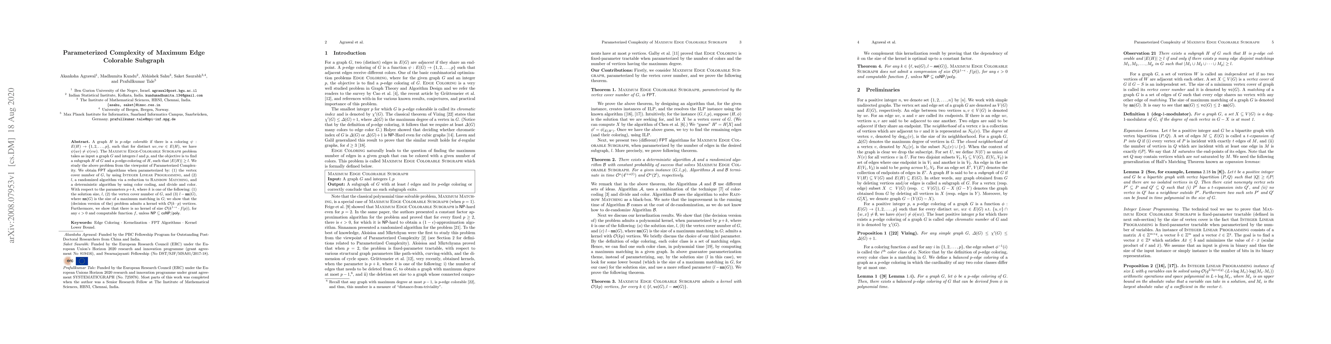 The paper studies the parameterized complexity of the Maximum Edge-Colorable Subgraph problem, providing FPT algorithms when parameterized by vertex cover number and by the desired edge count. It also shows kernelization results for various parameters and proves the problem's kernel size limitations under complexity assumptions.