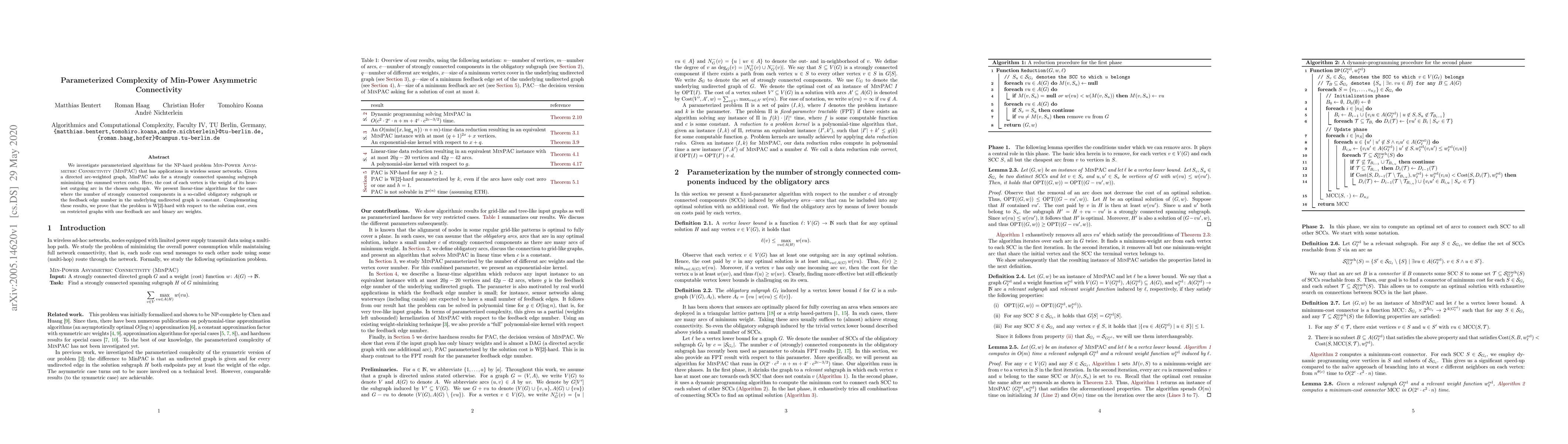 This paper explores parameterized algorithms for the NP-hard Min-Power Asymmetric Connectivity (MinPAC) problem, focusing on directed arc-weighted graphs. It presents linear-time solutions for specific cases and proves the problem's W[2]-hardness, even on restricted graphs with simple arc weights.