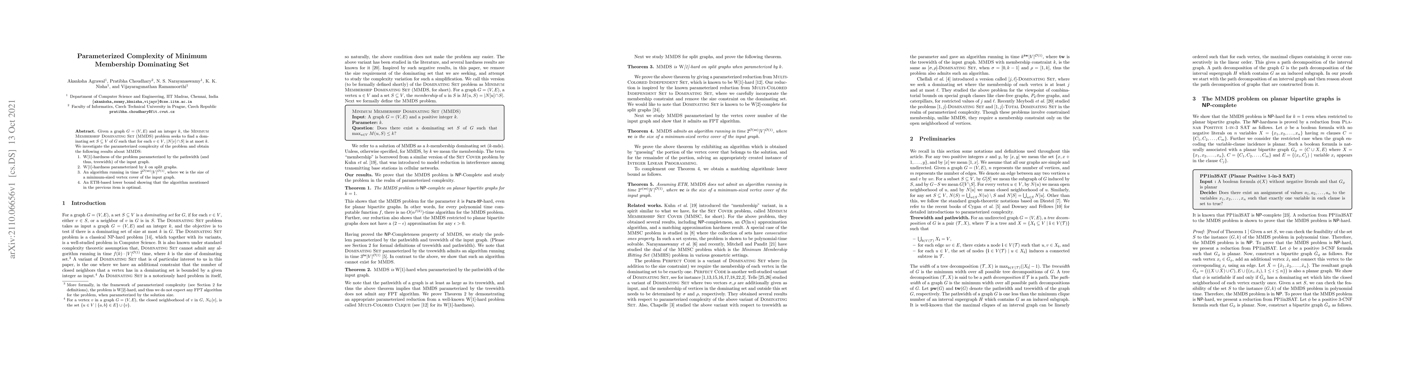 The Minimum Membership Dominating Set problem is W[1]-hard when parameterized by pathwidth, treewidth, or $k$ on split graphs. An algorithm with a runtime of $2^{\mathcal{O}(\textbf{vc})} |V|^{\mathcal{O}(1)}$ is optimal under ETH, where $\textbf{vc}$ denotes the size of a minimum vertex cover.