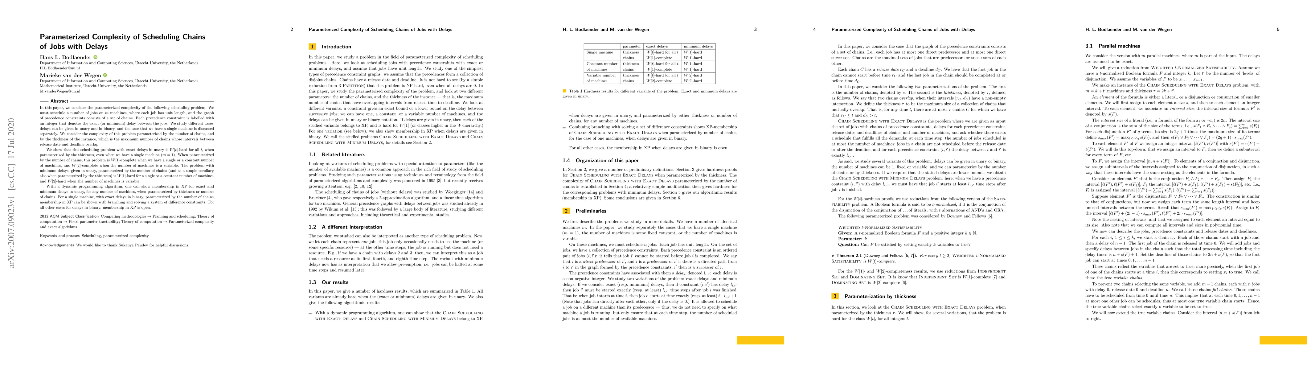 In this paper, we consider the parameterized complexity of the following scheduling problem. We must schedule a number of jobs on $m$ machines, where each job has unit length, and the graph of precedence constraints consists of a set of chains. Each precedence constraint is labelled with an integer that denotes the exact (or minimum) delay between the jobs. We study different cases; delays can be given in unary and in binary, and the case that we have a single machine is discussed separately. We consider the complexity of this problem parameterized by the number of chains, and by the thickness of the instance, which is the maximum number of chains whose intervals between release date and deadline overlap. We show that this scheduling problem with exact delays in unary is $W[t]$-hard for all $t$, when parameterized by the thickness, even when we have a single machine ($m = 1$). When parameterized by the number of chains, this problem is $W[1]$-complete when we have a single or a constant number of machines, and $W[2]$-complete when the number of machines is a variable. The problem with minimum delays, given in unary, parameterized by the number of chains (and as a simple corollary, also when parameterized by the thickness) is $W[1]$-hard for a single or a constant number of machines, and $W[2]$-hard when the number of machines is variable. With a dynamic programming algorithm, one can show membership in XP for exact and minimum delays in unary, for any number of machines, when parameterized by thickness or number of chains. For a single machine, with exact delays in binary, parameterized by the number of chains, membership in XP can be shown with branching and solving a system of difference constraints. For all other cases for delays in binary, membership in XP is open.