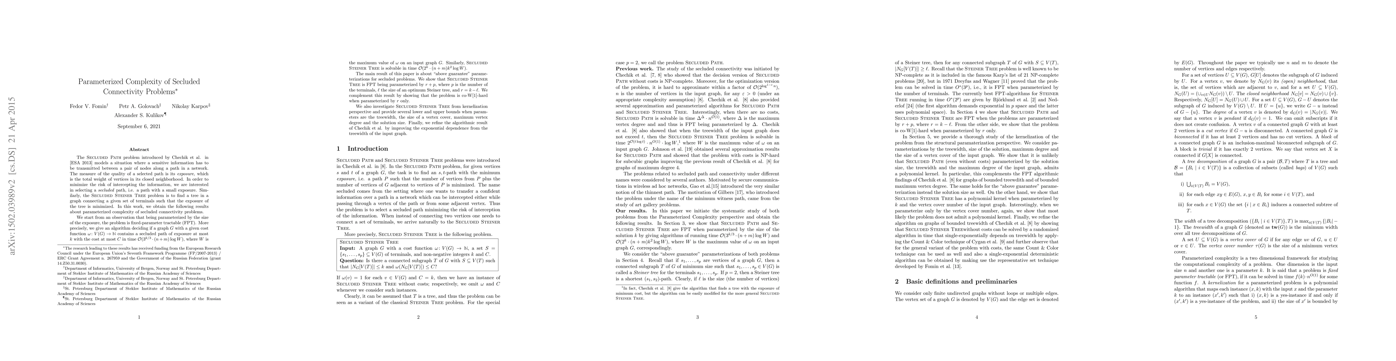 This paper explores the parameterized complexity of Secluded Connectivity Problems, focusing on finding paths and trees that minimize exposure in networks. It presents FPT-algorithms for determining secluded paths and Steiner trees, initiates "above guarantee" parameterizations, and provides kernelization bounds for the Secluded Steiner Tree problem, refining previous results on treewidth dependence.