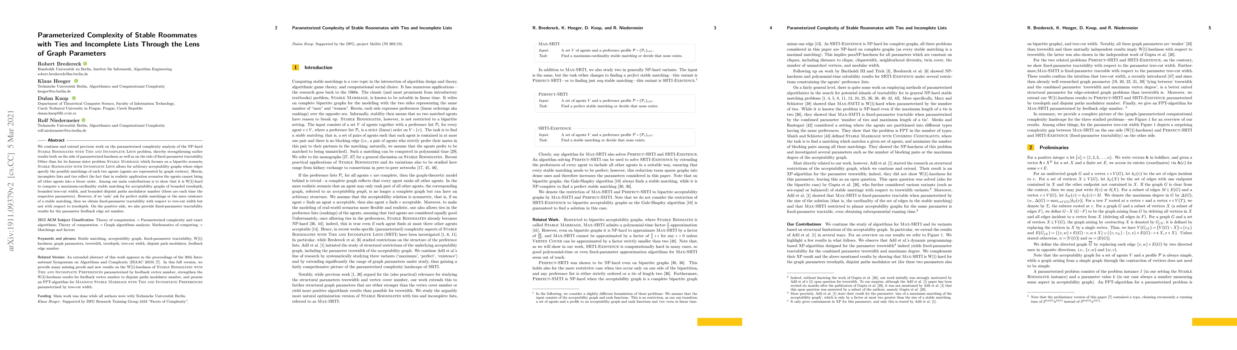 This paper analyzes the parameterized complexity of the Stable Roommates with Ties and Incomplete Lists problem, showing W[1]-hardness for certain graph parameters but achieving fixed-parameter tractability for the existence of stable matchings with respect to tree-cut width and feedback edge set number.