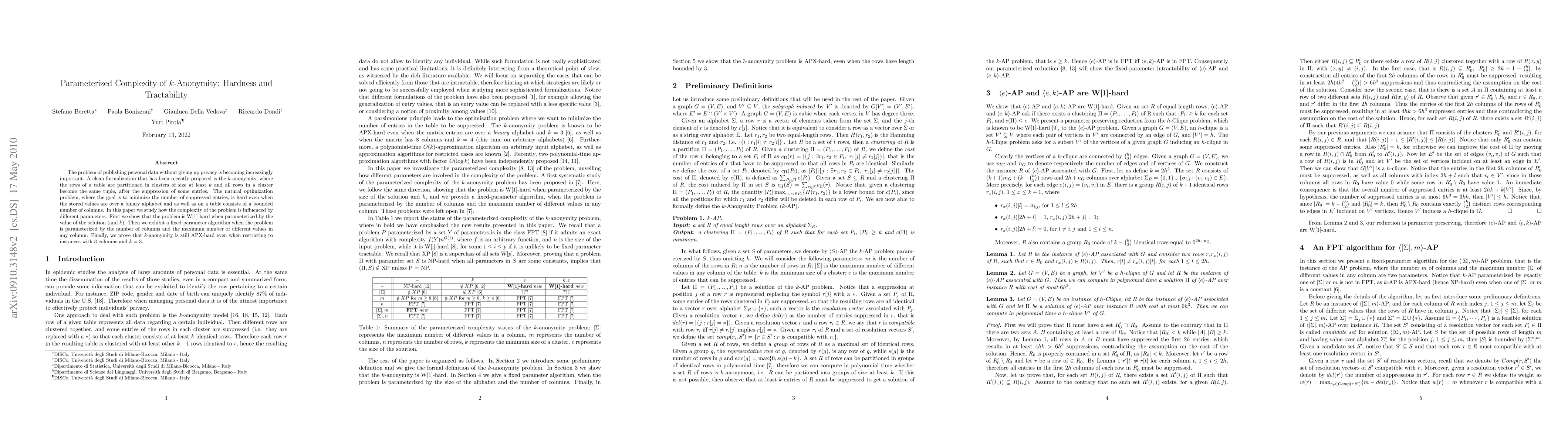This paper investigates the parameterized complexity of the $k$-anonymity problem, demonstrating its W[1]-hardness when parameterized by the solution size and $k$. It also presents a fixed parameter algorithm when parameterized by the size of the alphabet and the number of columns, and shows that restricting the problem to records of length 3 and $k=3$ remains APX-hard.