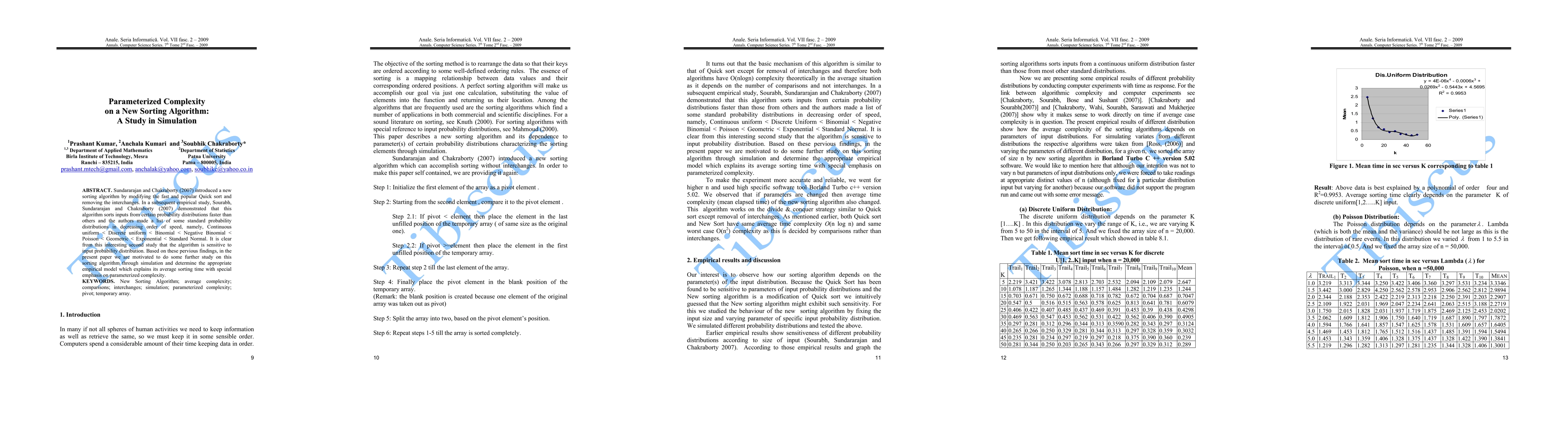 Sundararajan and Chakraborty (2007) introduced a new sorting algorithm by modifying the fast and popular Quick sort and removing the interchanges. In a subsequent empirical study, Sourabh, Sundararajan and Chakraborty (2007) demonstrated that this algorithm sorts inputs from certain probability distributions faster than others and the authors made a list of some standard probability distributions in decreasing order of speed, namely, Continuous uniform < Discrete uniform < Binomial < Negative Binomial < Poisson < Geometric < Exponential < Standard Normal. It is clear from this interesting second study that the algorithm is sensitive to input probability distribution. Based on these pervious findings, in the present paper we are motivated to do some further study on this sorting algorithm through simulation and determine the appropriate empirical model which explains its average sorting time with special emphasis on parameterized complexity.