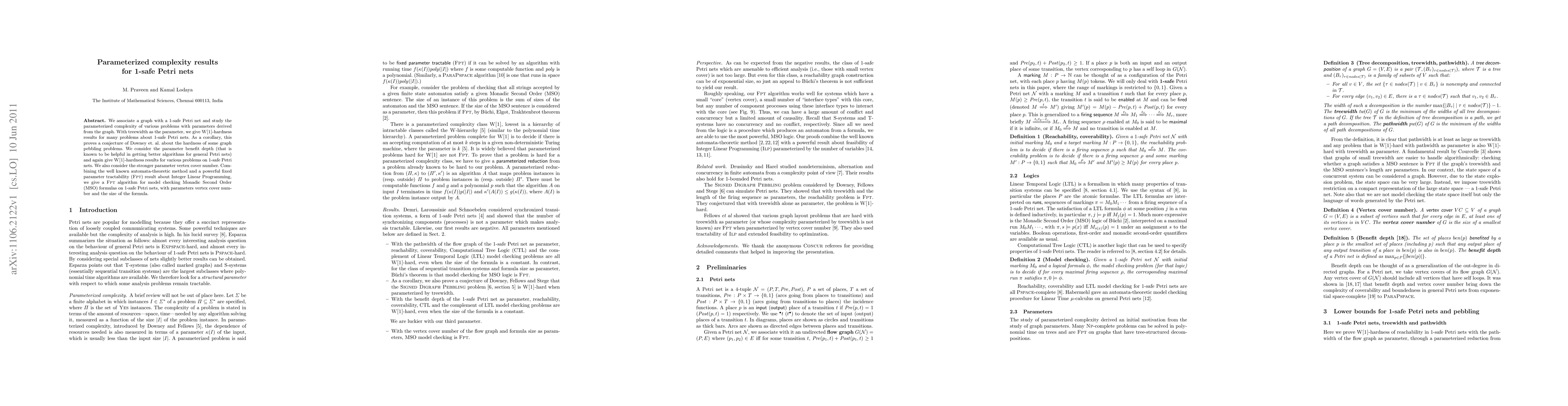 This paper investigates the parameterized complexity of problems related to 1-safe Petri nets, demonstrating W[1]-hardness for various problems when parameterized by treewidth and benefit depth. It also provides a fixed parameter tractable algorithm for model checking MSO formulas on these nets, parameterized by vertex cover number and formula size.