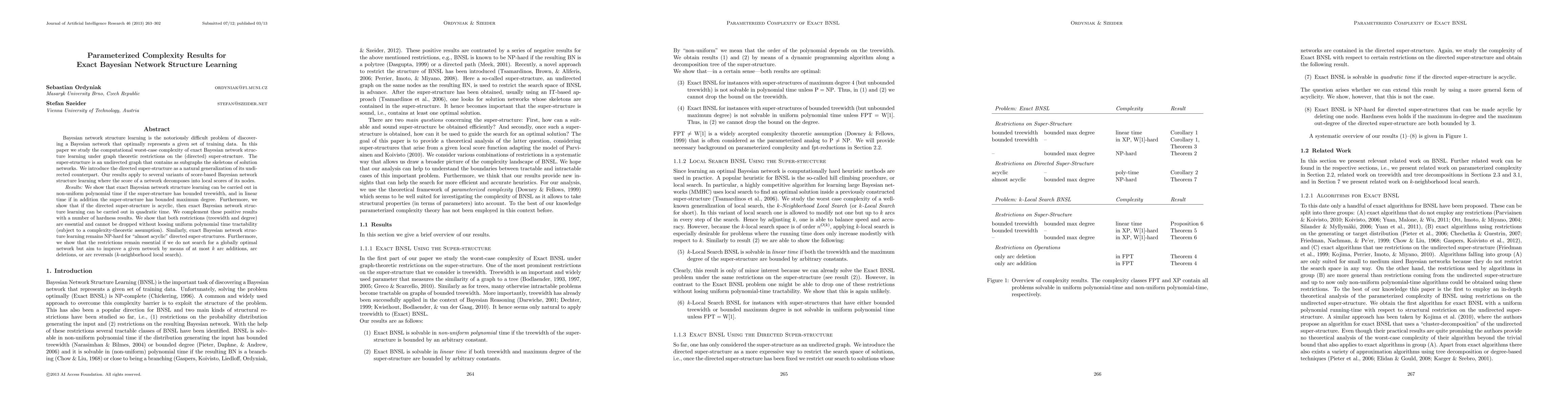 This paper investigates the computational complexity of exact Bayesian network structure learning under graph restrictions, showing that it can be solved in polynomial time under bounded treewidth and degree conditions. It also demonstrates the essential nature of these restrictions through NP-hardness results and the intractability of "almost acyclic" structures.