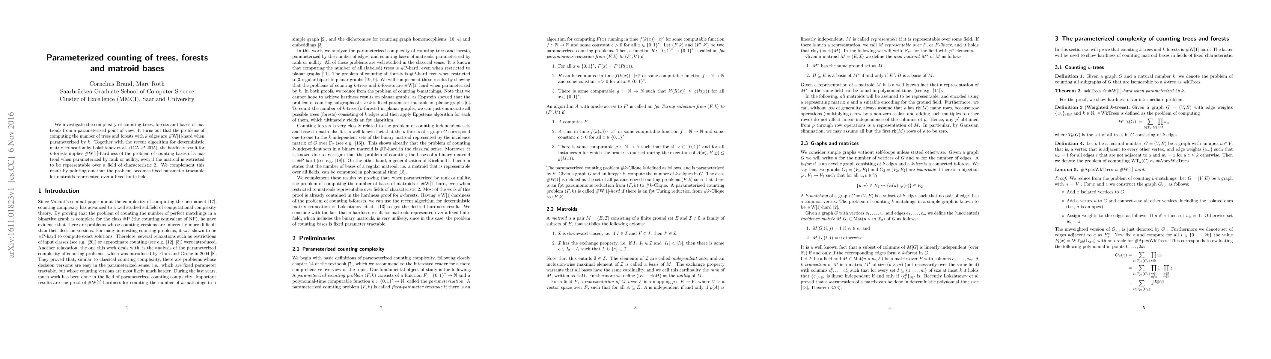 This paper studies the complexity of counting trees, forests, and matroid bases with a parameterized approach. It establishes $\# W[1]$-hardness for counting trees and forests with $k$ edges parameterized by $k$. The result extends to matroid base counting when parameterized by rank or nullity, though it becomes fixed parameter tractable for matroids over a fixed finite field.