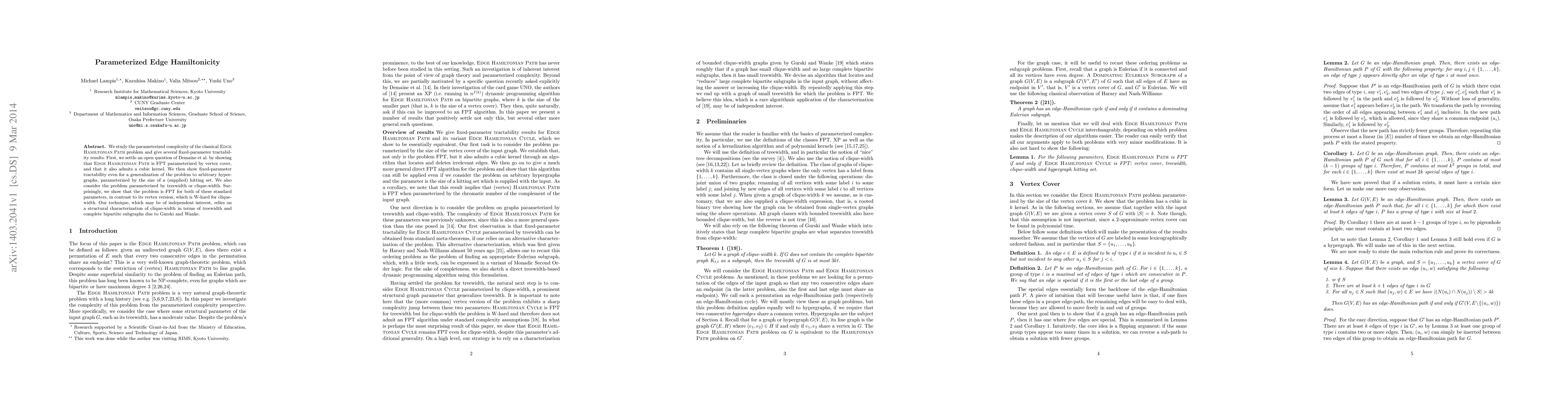 This paper investigates the parameterized complexity of the Edge Hamiltonian Path problem, proving its fixed-parameter tractability (FPT) when parameterized by vertex cover and providing a cubic kernel. It also demonstrates FPT for hypergraph generalizations parameterized by hitting set size, and surprisingly shows FPT for treewidth and clique-width, contrasting with the W-hardness of the vertex version for clique-width. The technique leverages a structural characterization of clique-width.