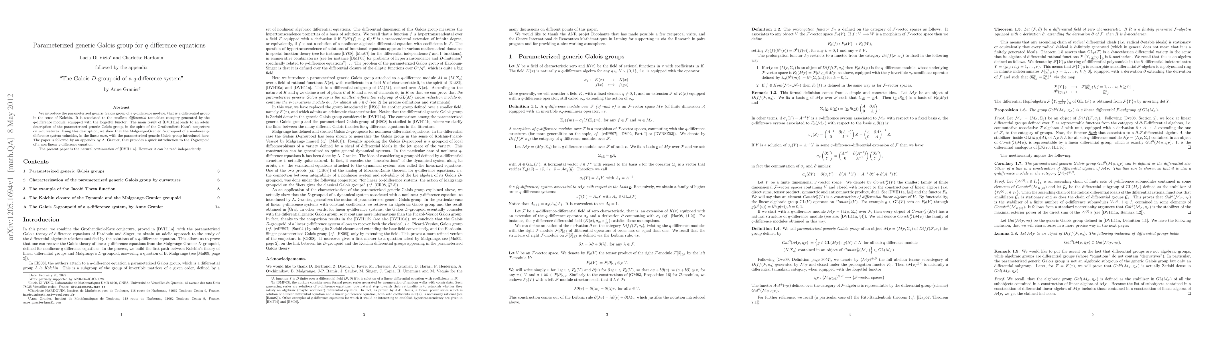 This paper introduces the parameterized generic Galois group for q-difference modules, linking it to the smallest differential tannakian category. The authors use previous results to provide an adelic description of this group, showing its equivalence to the Malgrange-Granier D-groupoid in the linear case. The paper includes an appendix by Anne Granier that briefly explains the D-groupoid for non-linear q-difference systems.