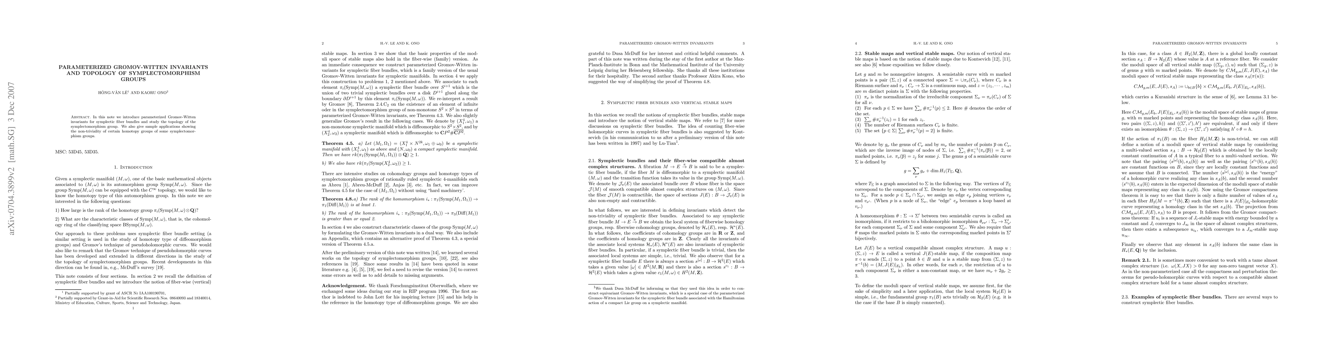 This paper introduces parameterized Gromov-Witten invariants for symplectic fiber bundles and explores the topology of symplectomorphism groups, demonstrating the non-triviality of certain homotopy groups within these groups.