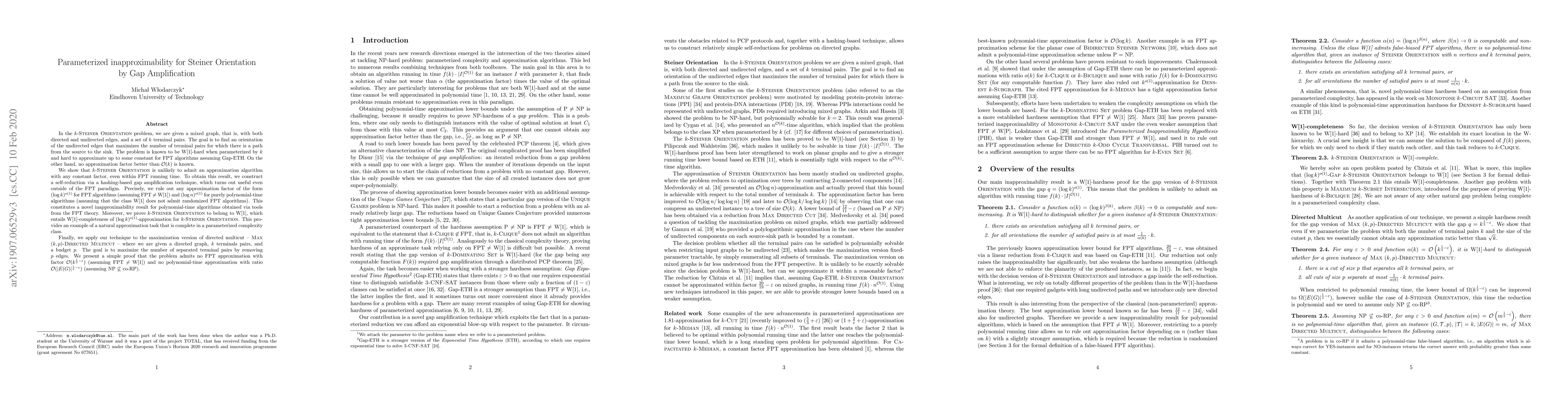 In the $k$-Steiner Orientation problem, we are given a mixed graph, that is, with both directed and undirected edges, and a set of $k$ terminal pairs. The goal is to find an orientation of the undirected edges that maximizes the number of terminal pairs for which there is a path from the source to the sink. The problem is known to be W[1]-hard when parameterized by k and hard to approximate up to some constant for FPT algorithms assuming Gap-ETH. On the other hand, no approximation factor better than $O(k)$ is known. We show that $k$-Steiner Orientation is unlikely to admit an approximation algorithm with any constant factor, even within FPT running time. To obtain this result, we construct a self-reduction via a hashing-based gap amplification technique, which turns out useful even outside of the FPT paradigm. Precisely, we rule out any approximation factor of the form $(\log k)^{o(1)}$ for FPT algorithms (assuming FPT $\ne$ W[1]) and $(\log n)^{o(1)}$ for~purely polynomial-time algorithms (assuming that the class W[1] does not admit randomized FPT algorithms). Moreover, we prove $k$-Steiner Orientation to belong to W[1], which entails W[1]-completeness of $(\log k)^{o(1)}$-approximation for $k$-Steiner Orientation This provides an example of a natural approximation task that is complete in a parameterized complexity class. Finally, we apply our technique to the maximization version of directed multicut - Max $(k,p)$-Directed Multicut - where we are given a directed graph, $k$ terminals pairs, and a budget $p$. The goal is to maximize the number of separated terminal pairs by removing $p$ edges. We present a simple proof that the problem admits no FPT approximation with factor $O(k^{\frac 1 2 - \epsilon})$ (assuming FPT $\ne$ W[1]) and no polynomial-time approximation with ratio $O(|E(G)|^{\frac 1 2 - \epsilon})$ (assuming NP $\not\subseteq$ co-RP).