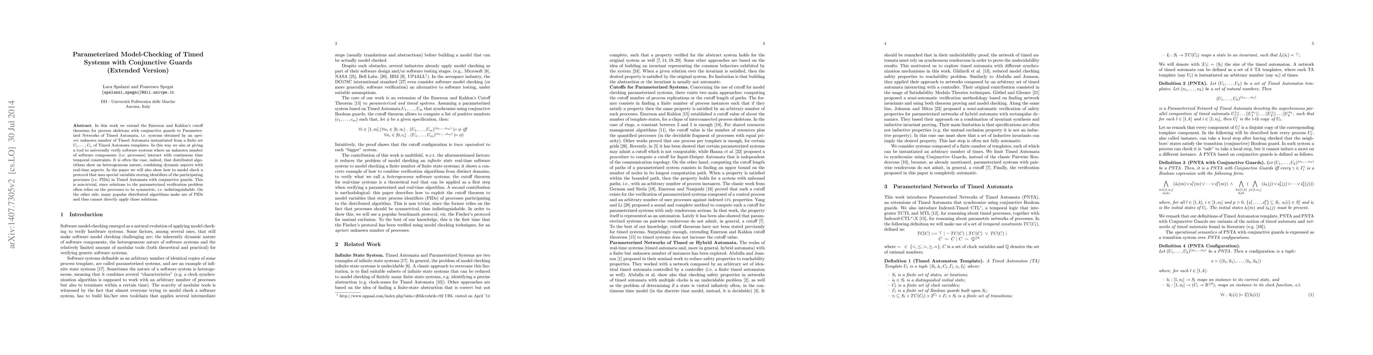 In this work we extend the Emerson and Kahlon's cutoff theorems for process skeletons with conjunctive guards to Parameterized Networks of Timed Automata, i.e. systems obtained by an \emph{apriori} unknown number of Timed Automata instantiated from a finite set $U_1, \dots, U_n$ of Timed Automata templates. In this way we aim at giving a tool to universally verify software systems where an unknown number of software components (i.e. processes) interact with continuous time temporal constraints. It is often the case, indeed, that distributed algorithms show an heterogeneous nature, combining dynamic aspects with real-time aspects. In the paper we will also show how to model check a protocol that uses special variables storing identifiers of the participating processes (i.e. PIDs) in Timed Automata with conjunctive guards. This is non-trivial, since solutions to the parameterized verification problem often relies on the processes to be symmetric, i.e. indistinguishable. On the other side, many popular distributed algorithms make use of PIDs and thus cannot directly apply those solutions.