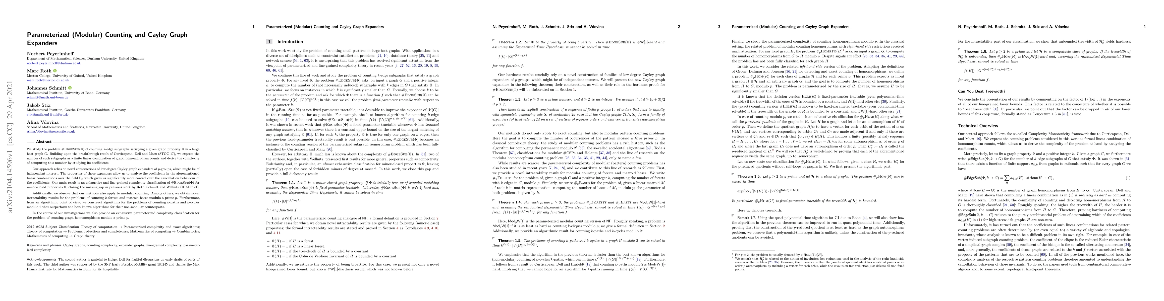 We study the problem $\#\mathrm{EdgeSub}(\Phi)$ of counting $k$-edge subgraphs satisfying a given graph property $\Phi$ in a large host graph $G$. Building upon the breakthrough result of Curticapean, Dell and Marx (STOC 17), we express the number of such subgraphs as a finite linear combination of graph homomorphism counts and derive the complexity of computing this number by studying its coefficients. Our approach relies on novel constructions of low-degree Cayley graph expanders of $p$-groups, which might be of independent interest. The properties of those expanders allow us to analyse the coefficients in the aforementioned linear combinations over the field $\mathbb{F}_p$ which gives us significantly more control over the cancellation behaviour of the coefficients. Our main result is an exhaustive and fine-grained complexity classification of $\#\mathrm{EdgeSub}(\Phi)$ for minor-closed properties $\Phi$, closing the missing gap in previous work by Roth, Schmitt and Wellnitz (ICALP 21). Additionally, we observe that our methods also apply to modular counting. Among others, we investigate the problems of modular counting of paths, cycles, forests and matroid bases. In the course of our investigations we also provide an exhaustive parameterized complexity classification for the problem of counting graph homomorphisms modulo a prime $p$.