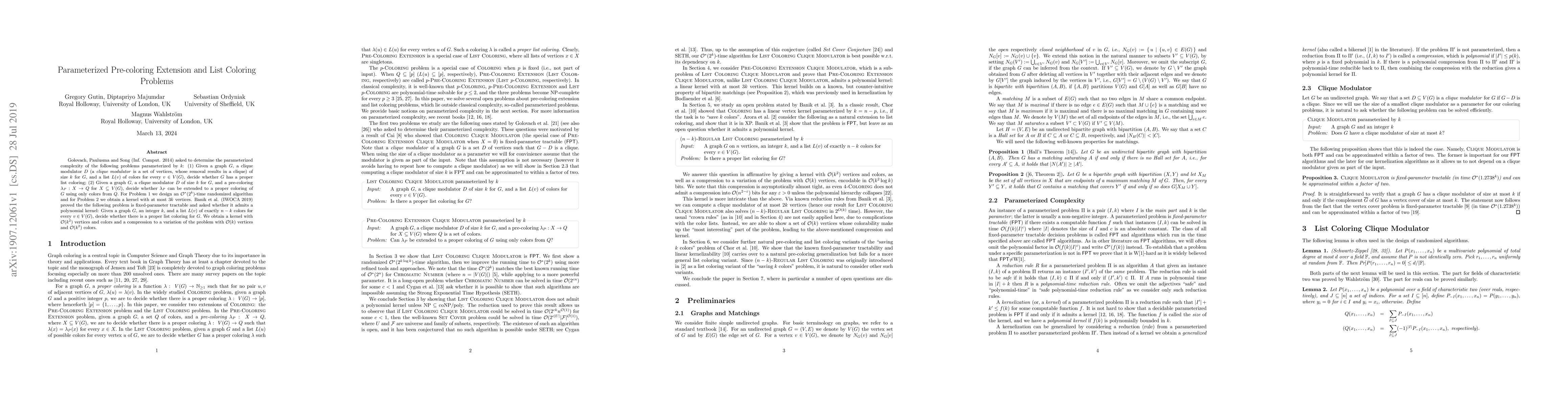 This paper investigates the parameterized complexity of list coloring and pre-coloring extension problems in graphs with a given clique modulator. It presents an $O^*(2^k)$-time randomized algorithm for the list coloring problem and a kernel with at most $3k$ vertices for the pre-coloring extension problem. Additionally, it provides a polynomial kernel with $O(k^2)$ vertices and colors for a related problem.
